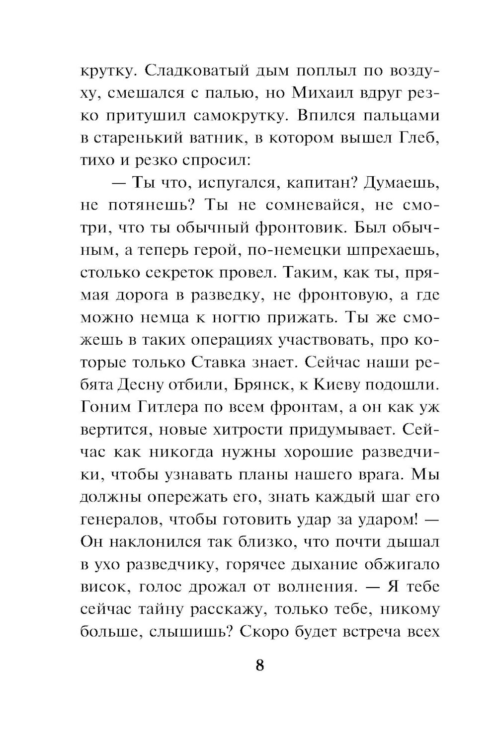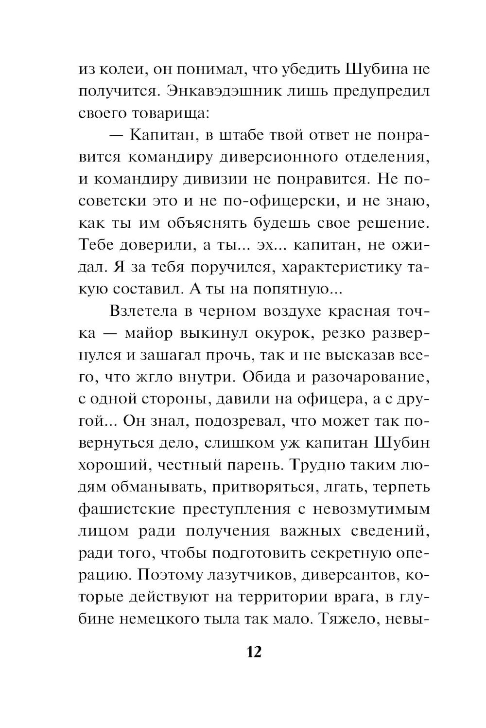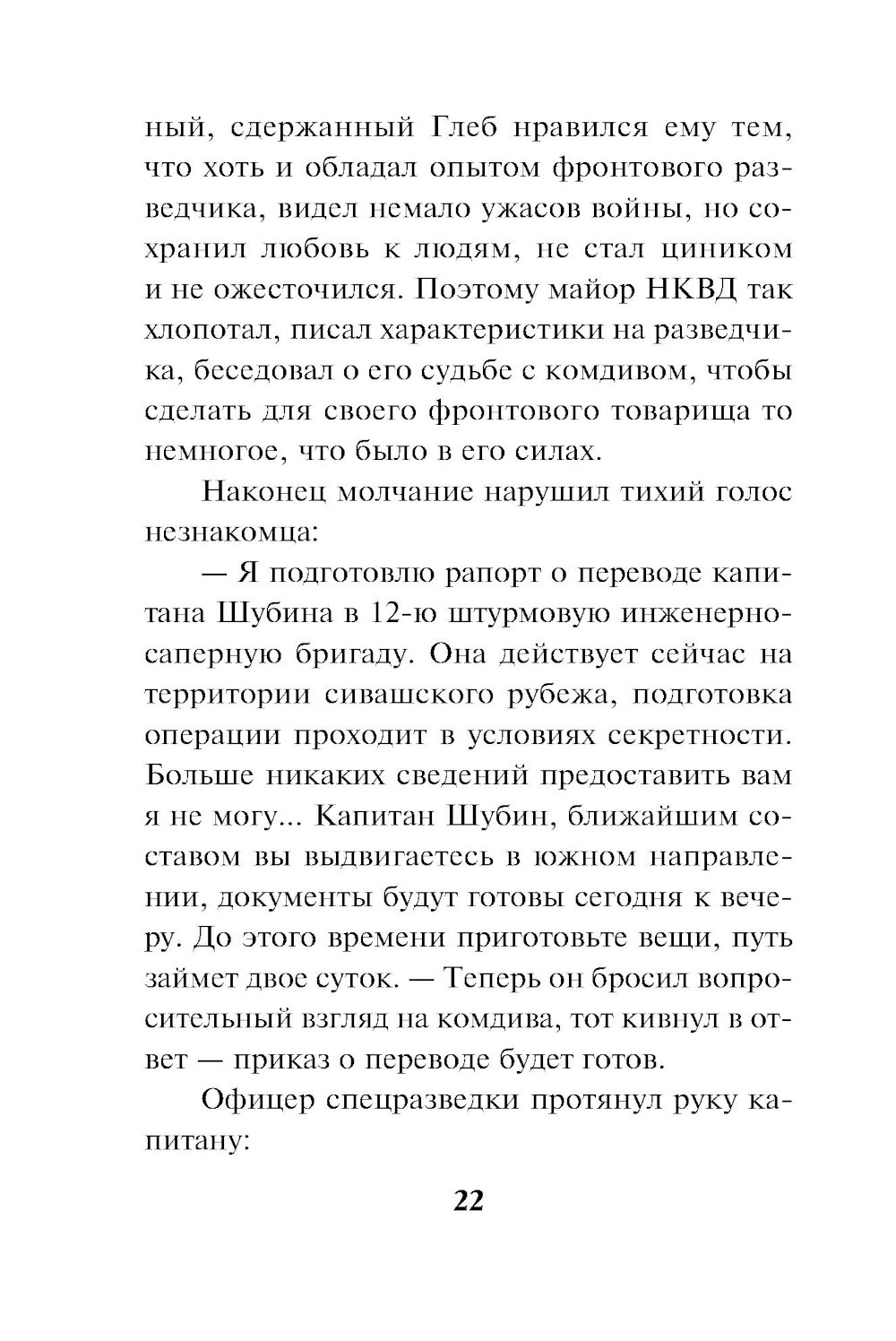 Боевые романы о ежедневном подвиге советских фронтовых разведчиков. Поединок силы и духа, когда до переднего края врага всего несколько шагов. Подробности жестоких боев, о которых не рассказывают даже ветераны - участники тех событий. Советское командование разрабатывает Крымскую наступательную операцию. Группе разведчиков капитана Глеба Шубина приказано разведать обстановку в районе залива Сиваш. Бойцы проникают на территорию противника и собирают данные о важном узле немецкой обороны. Подоспевшие подразделения довершают работу разведчиков. Гитлеровские укрепления уничтожены. По дороге на исходный рубеж отряд капитана Шубина останавливается на ночлег в полуразрушенной деревне. Совершившие за один день невозможное уставшие красноармейцы еще не знают, что предстоящая ночь готовит им страшный сюрприз...| Издательство | Эксмо |