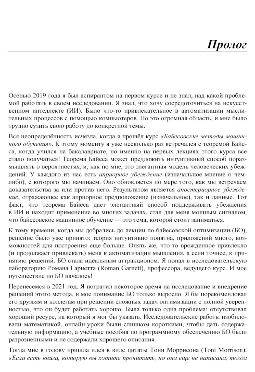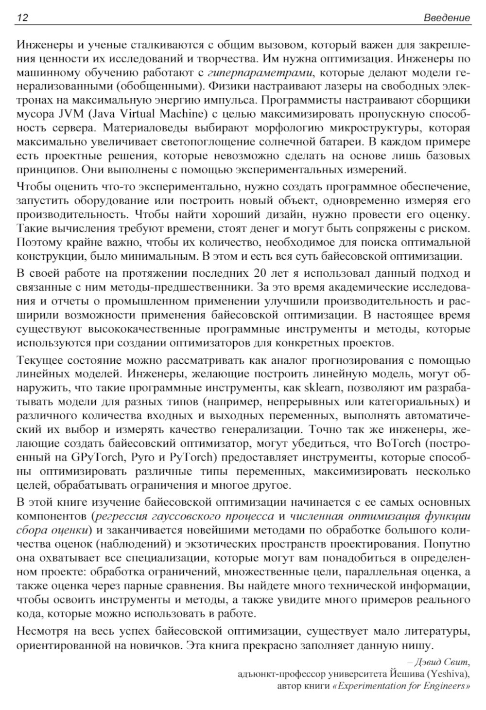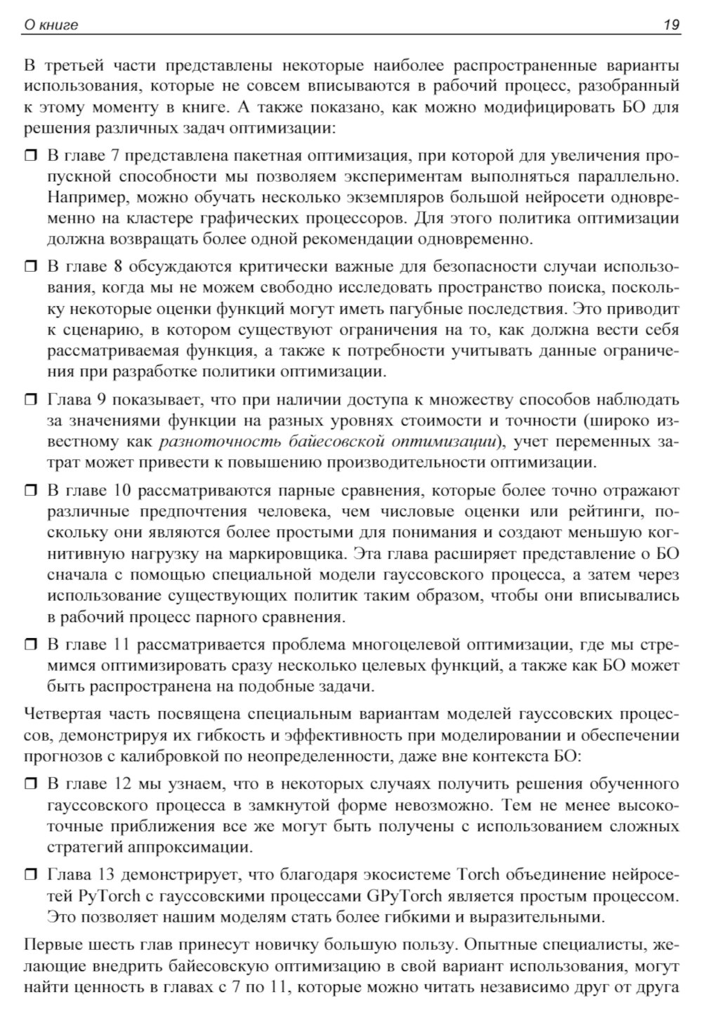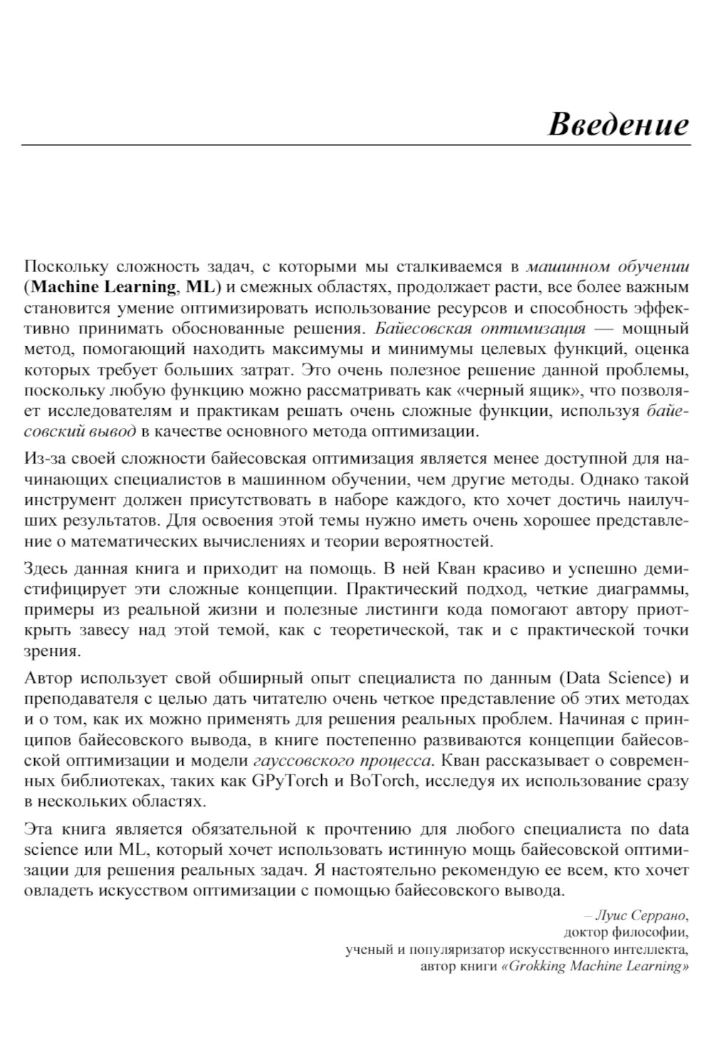 Книга рассказывает об оптимизации моделей машинного обучения на основе байесовского метода и теории вероятностей. Примеры составлены на языке Python с использованием библиотек PyTorch, GPyTorch и BoTorch. Описаны приёмы настройки гиперпараметров, гауссовское распределение, использование политик машинного обучения, в частности на основе задачи о многоруких бандитах, повышение производительности вычислений, многовариантная оптимизация с учётом полезности и затрат, а также применение байесовского метода в специализированных сценариях. Оптимизация в области машинного обучения заключается в достижении максимально качественных прогнозов за минимально возможное количество шагов. Так формируются кратчайшие маршруты доставки, идеальные цены, персонализированные рекомендации и т. д. В основе оптимизации по байесовскому методу лежит математический аппарат теории вероятностей. В рамках такой оптимизации вырабатываются способы настройки функций, алгоритмов и гиперпараметров машинного обучения. В книге рассказано, как выстраивать эффективные процессы машинного обучения с использованием байесовского подхода. Показано, как обучать модели на больших наборах данных, настраивать гиперпараметры и использовать метод парных сравнений.
