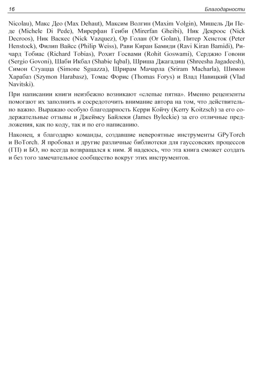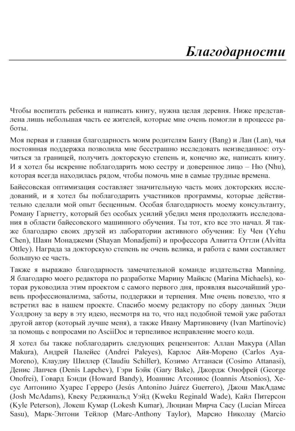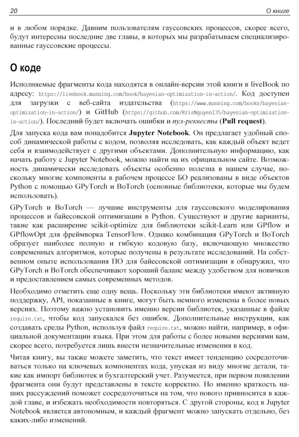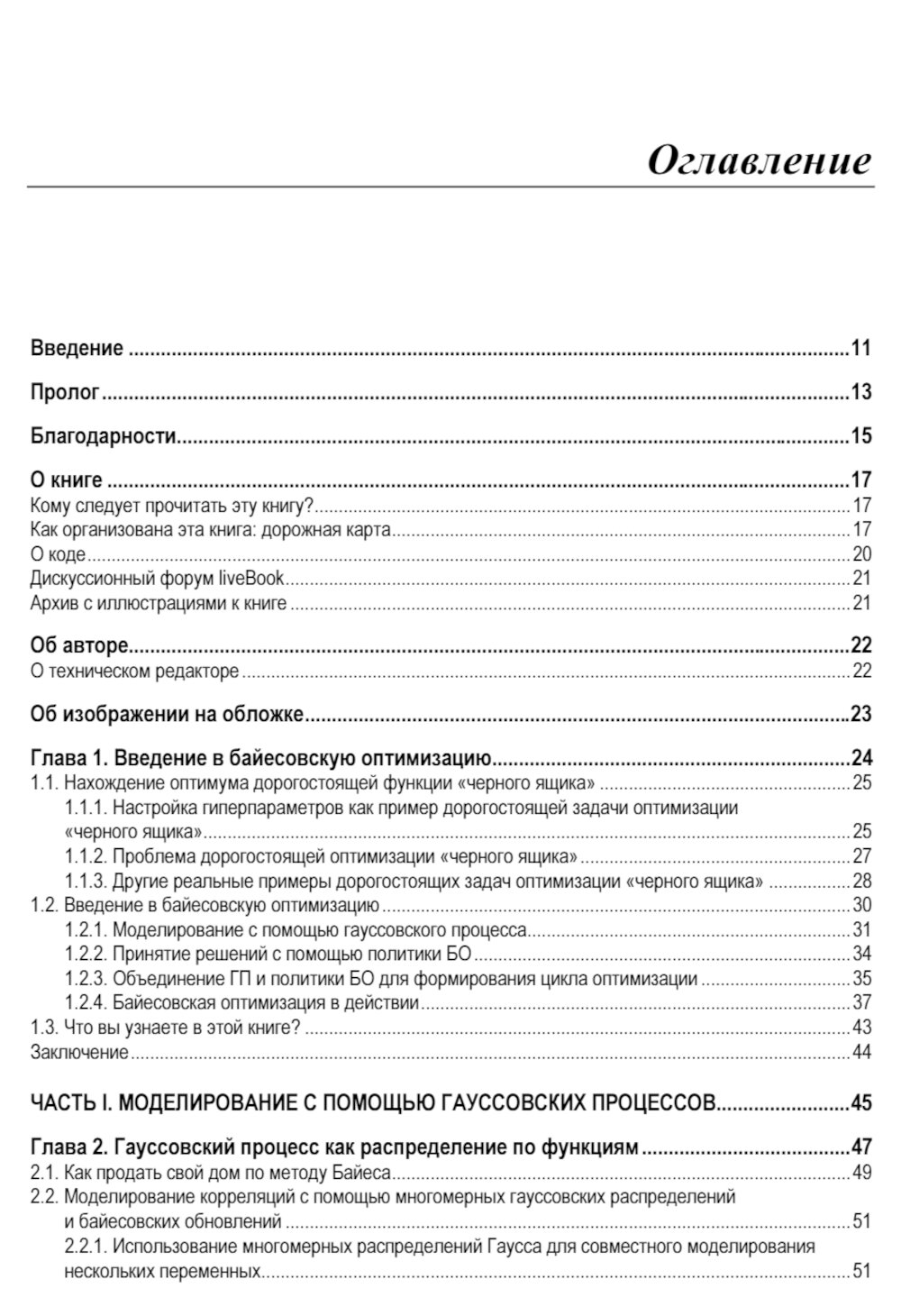 Книга рассказывает об оптимизации моделей машинного обучения на основе байесовского метода и теории вероятностей. Примеры составлены на языке Python с использованием библиотек PyTorch, GPyTorch и BoTorch. Описаны приёмы настройки гиперпараметров, гауссовское распределение, использование политик машинного обучения, в частности на основе задачи о многоруких бандитах, повышение производительности вычислений, многовариантная оптимизация с учётом полезности и затрат, а также применение байесовского метода в специализированных сценариях. Оптимизация в области машинного обучения заключается в достижении максимально качественных прогнозов за минимально возможное количество шагов. Так формируются кратчайшие маршруты доставки, идеальные цены, персонализированные рекомендации и т. д. В основе оптимизации по байесовскому методу лежит математический аппарат теории вероятностей. В рамках такой оптимизации вырабатываются способы настройки функций, алгоритмов и гиперпараметров машинного обучения. В книге рассказано, как выстраивать эффективные процессы машинного обучения с использованием байесовского подхода. Показано, как обучать модели на больших наборах данных, настраивать гиперпараметры и использовать метод парных сравнений.