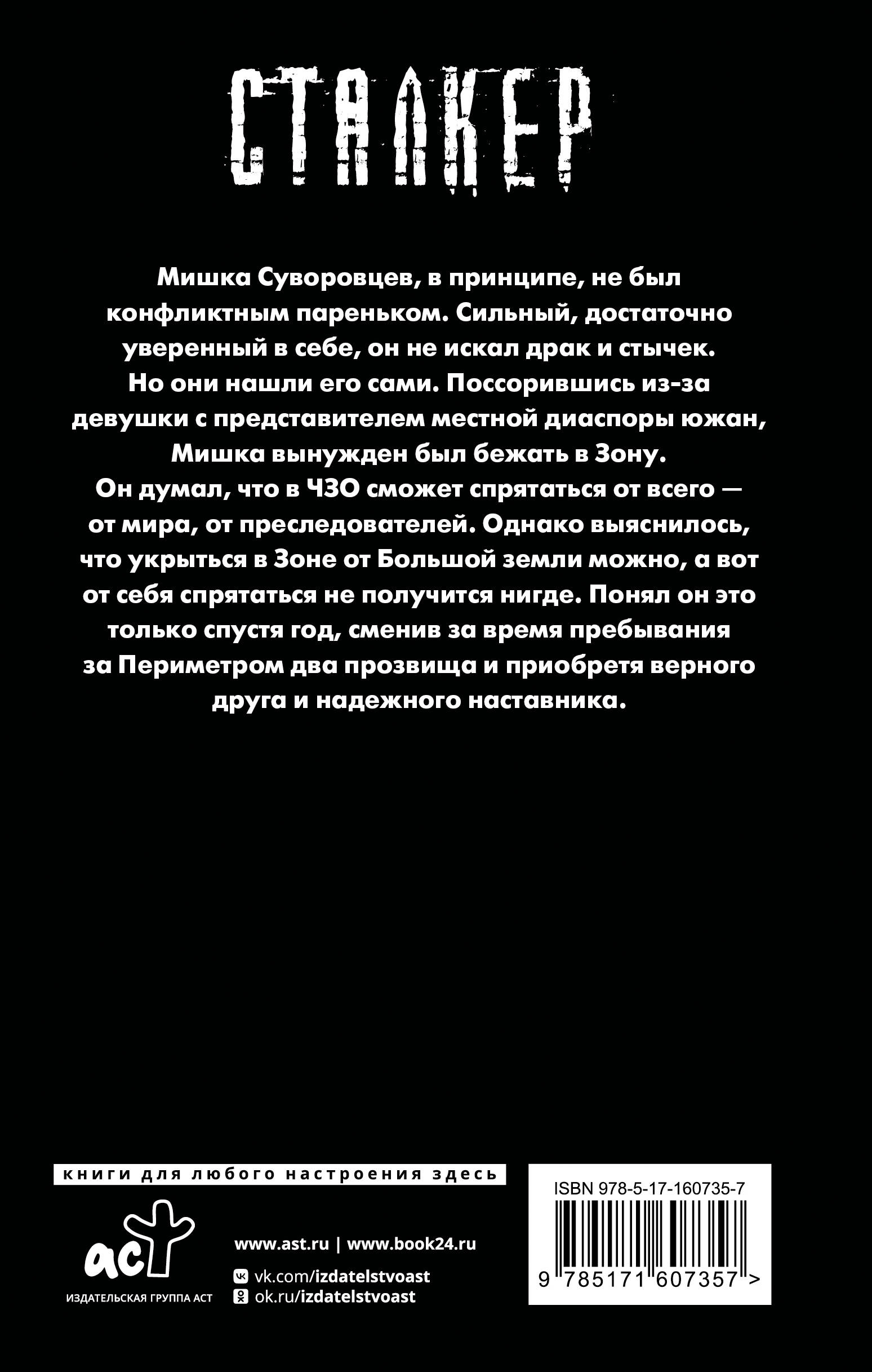 Мишка Суворовцев, в принципе, не был конфликтным пареньком. Сильный, достаточно уверенный в себе, он не искал драк и стычек. Но они нашли его сами. Поссорившись из-за девушки с представителем местной диаспоры южан, Мишка вынужден был бежать в Зону. Он думал, что в ЧЗО сможет спрятаться от всего - от мира, от преследователей. Однако выяснилось, что укрыться в Зоне от Большой земли можно, а вот от себя спрятаться не получится нигде. Понял он это только спустя год, сменив за время пребывания за Периметром два прозвища и приобретя верного друга и надежного наставника.| Издательство | Издательство "АСТ" |