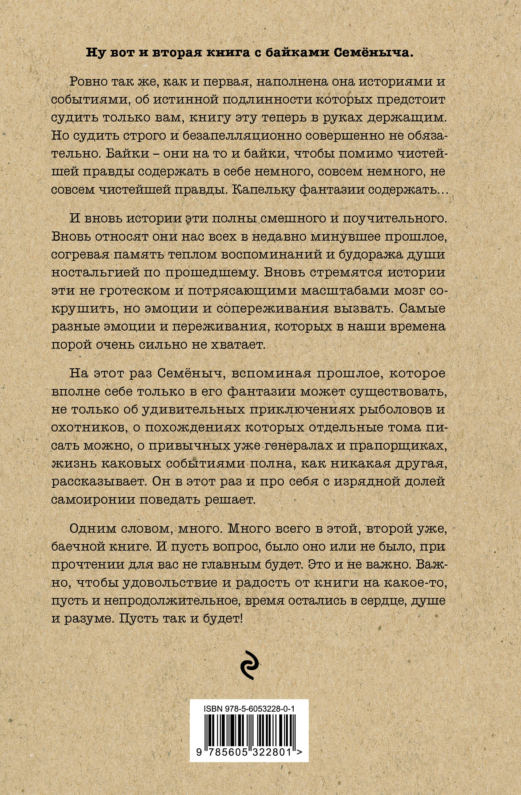 Ровно так же, как и первая, наполнена она историями и событиями, об истинной подлинности которых предстоит судить только вам, книгу эту теперь в руках держащим. Но судить строго и безапелляционно совершенно не обязательно. Байки - они на то и байки, чтобы помимо чистейшей правды содержать в себе немного, совсем немного, не совсем чистейшей правды. Капельку фантазии содержать… И вновь истории эти полны смешного и поучительного. Вновь относят они нас всех в недавно минувшее прошлое, согревая память теплом воспоминаний и будоража души ностальгией по прошедшему. Вновь стремятся истории эти не гротеском и потрясающими масштабами мозг сокрушить, но эмоции и сопереживания вызвать. Самые разные эмоции и переживания, которых в наши времена порой очень сильно не хватает. На этот раз Семёныч, вспоминая прошлое, которое вполне себе только в его фантазии может существовать, не только об удивительных приключениях рыболовов и охотников, о похождениях которых отдельные тома писать можно, о привычных уже генералах и прапорщиках, жизнь каковых событиями полна, как никакая другая, рассказывает. Он в этот раз и про себя с изрядной долей самоиронии поведать решает. Одним словом, много. Много всего в этой, второй уже, баечной книге. И пусть вопрос «было оно или не было» при прочтении для вас не главным будет. Это и не важно. Важно, чтобы удовольствие и радость от книги на какое-то, пусть и не продолжительное время, остались в сердце, душе и разуме. Пусть так и будет!| Издательство | ООО "Издательство "Эксмо" |
