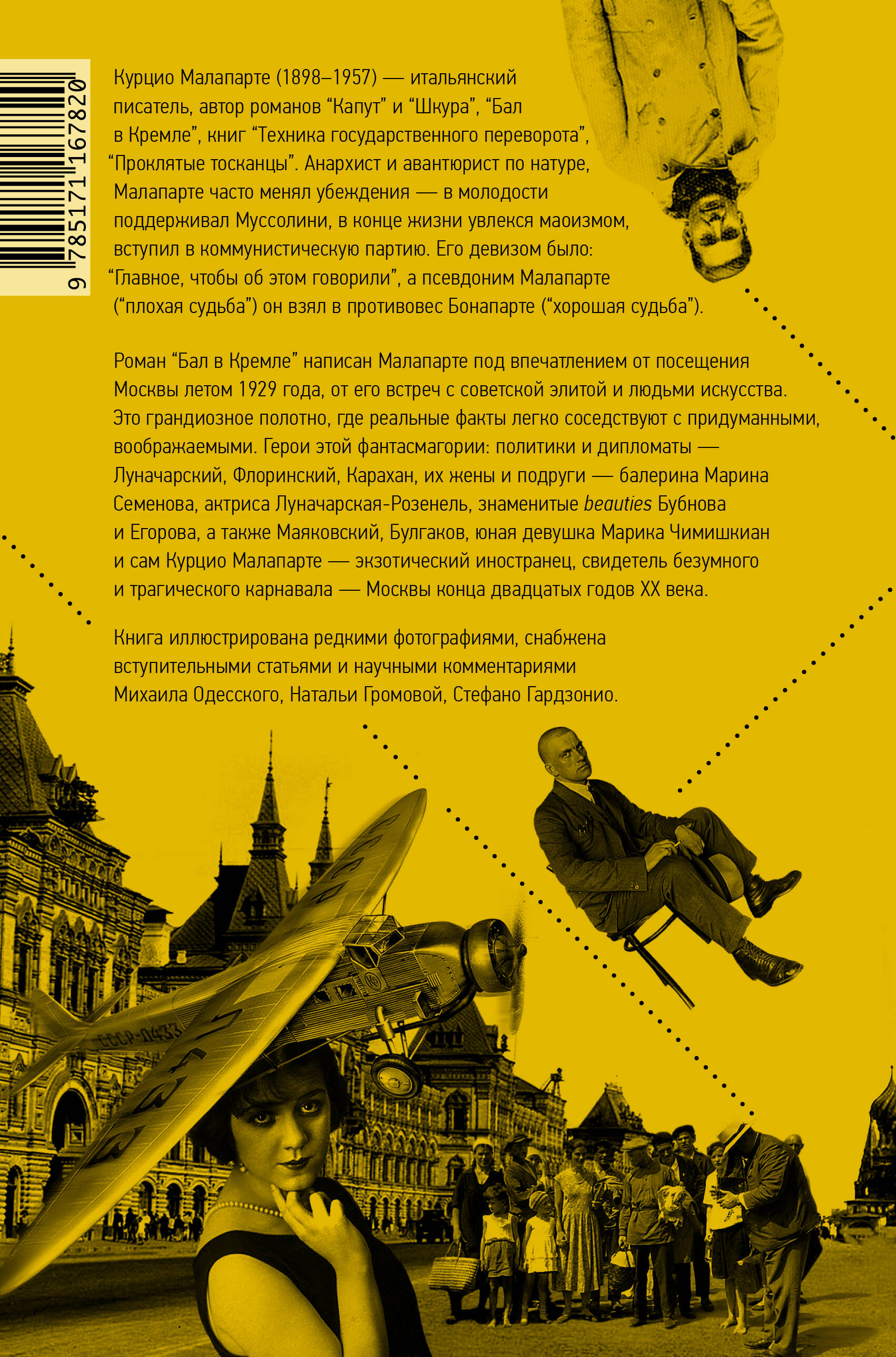 Курцио Малапарте (1898-1957) - итальянский писатель, автор романов "Капут" и "Шкура", "Бал в Кремле", книг "Техника государственного переворота", "Проклятые тосканцы". Анархист и авантюрист по натуре, Малапарте часто менял убеждения - в молодости поддерживал Муссолини, в конце жизни увлекся маоизмом, вступил в коммунистическую партию. Его девизом было: "Главное, чтобы об этом говорили", а псевдоним Малапарте ("плохая судьба") он взял в противовес Бонапарте ("хорошая судьба"). Роман "Бал в Кремле" написан Малапарте под впечатлением от посещения Москвы летом 1929 года, от его встреч с советской элитой и людьми искусства. Это грандиозное полотно, где реальные факты легко соседствуют с придуманными, воображаемыми. Герои этой фантасмагории: политики и дипломаты - Луначарский, Флоринский, Карахан, их жены и подруги - балерина Марина Семенова, актриса Луначарская-Розенель, знаменитые beauties Бубнова и Егорова, а также Маяковский, Булгаков, юная девушка Марика Чимишкиан и сам Курцио Малапарте - экзотический иностранец, свидетель безумного и трагического карнавала - Москвы конца двадцатых годов ХХ века. Книга иллюстрирована редкими фотографиями, снабжена вступительными статьями и научными комментариями Михаила Одесского, Натальи Громовой, Стефано Гардзонио.