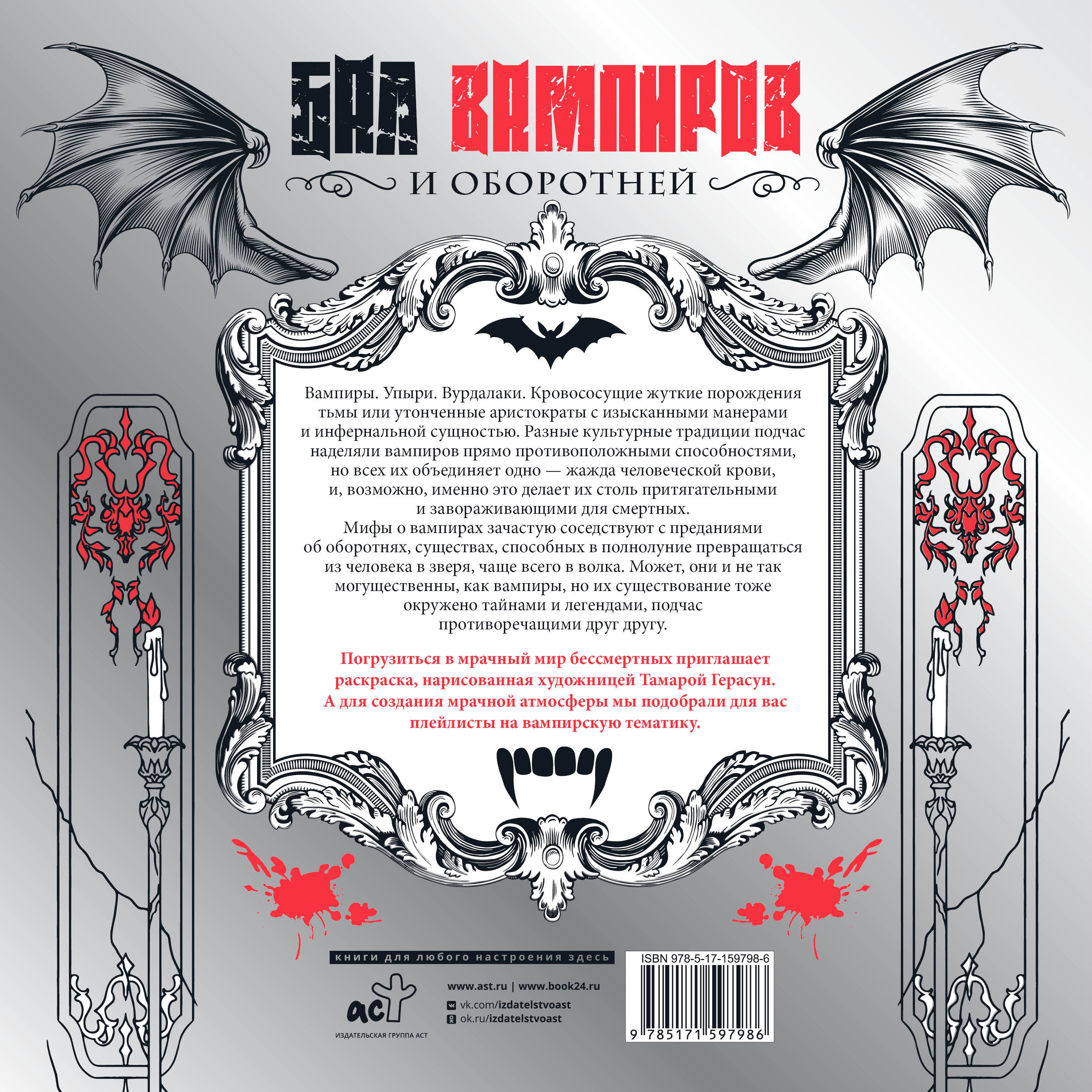 Вампиры. Упыри. Вурдалаки. Кровососущие жуткие порождения тьмы или утонченные аристократы с изысканными манерами и инфернальной сущностью. Разные культурные традиции подчас наделяли вампиров прямо противоположными способностями, но всех их объединяет одно - жажда человеческой крови, и, возможно, именно это делает их столь притягательными и завораживающими для смертных. Мифы о вампирах зачастую соседствуют с преданиями об оборотнях, существах, способных в полнолуние превращаться из человека в зверя, чаще всего в волка. Может, они и не так могущественны, как вампиры, но их существование тоже окружено тайнами и легендами, подчас противоречащими друг другу. Погрузиться в мрачный мир бессмертных приглашает раскраска, нарисованная художницей Тамарой Герасун. А для создания мрачной атмосферы мы подобрали для вас плейлисты на вампирскую тематику.| Издательство | Издательство "АСТ" |