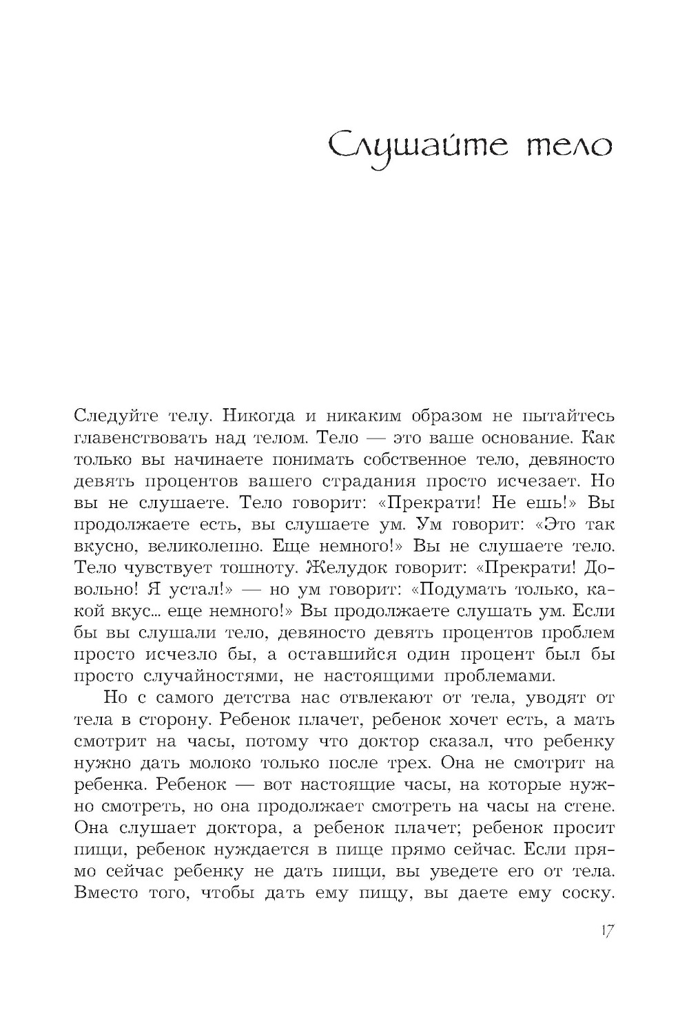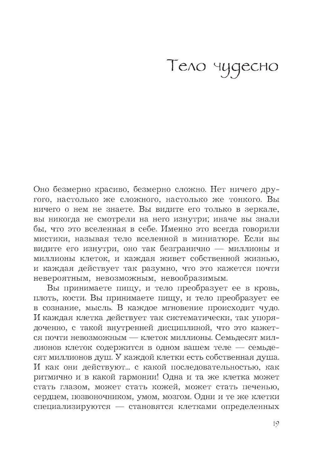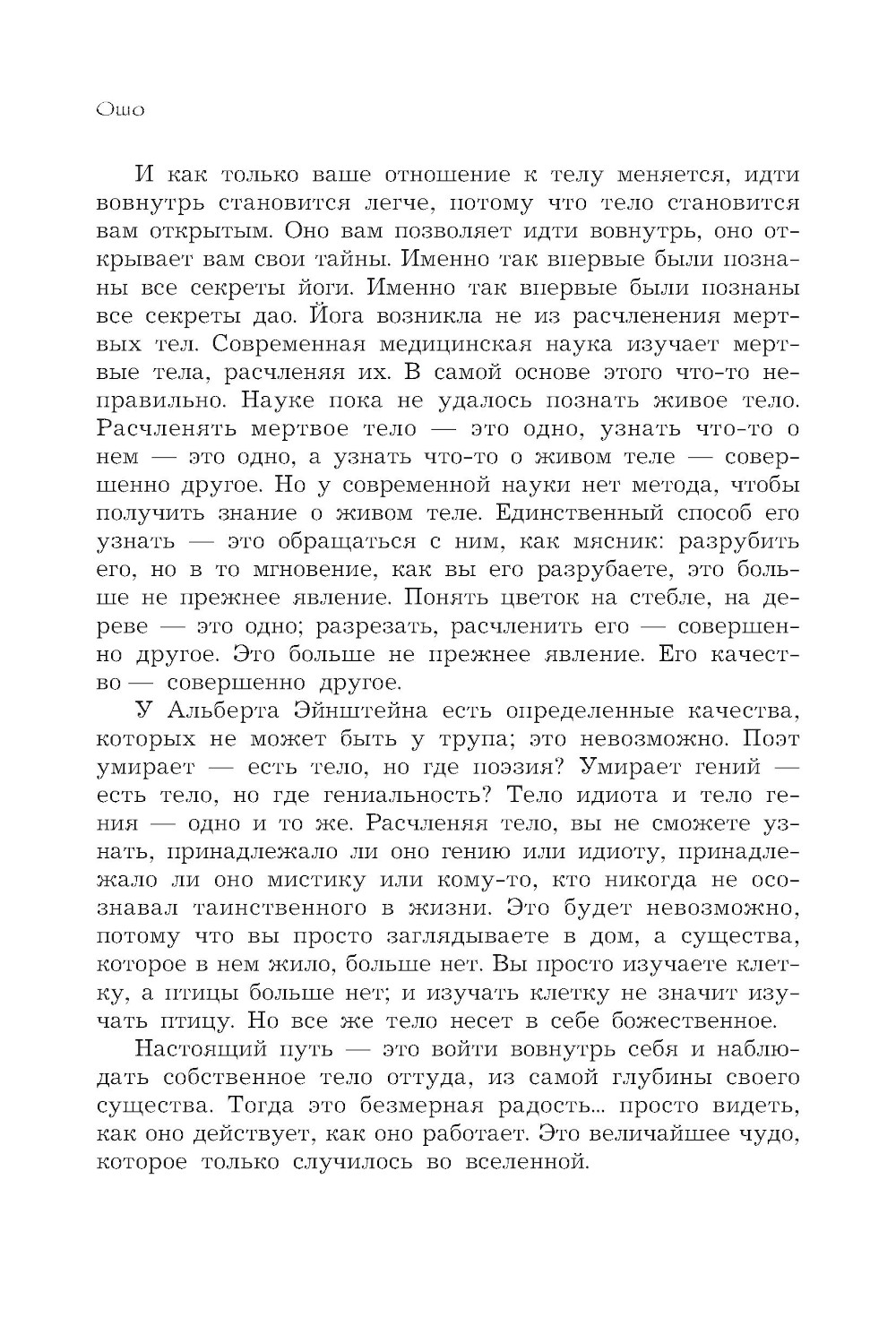 В этой книге, собранной из различных бесед, мы встречаемся с удивительно нежным и благодарным отношением к телу. Ошо передает свое знание с любовью, юмором и глубоким пониманием природы человека. Он подводит нас к мысли о том, что тело знает больше разума.