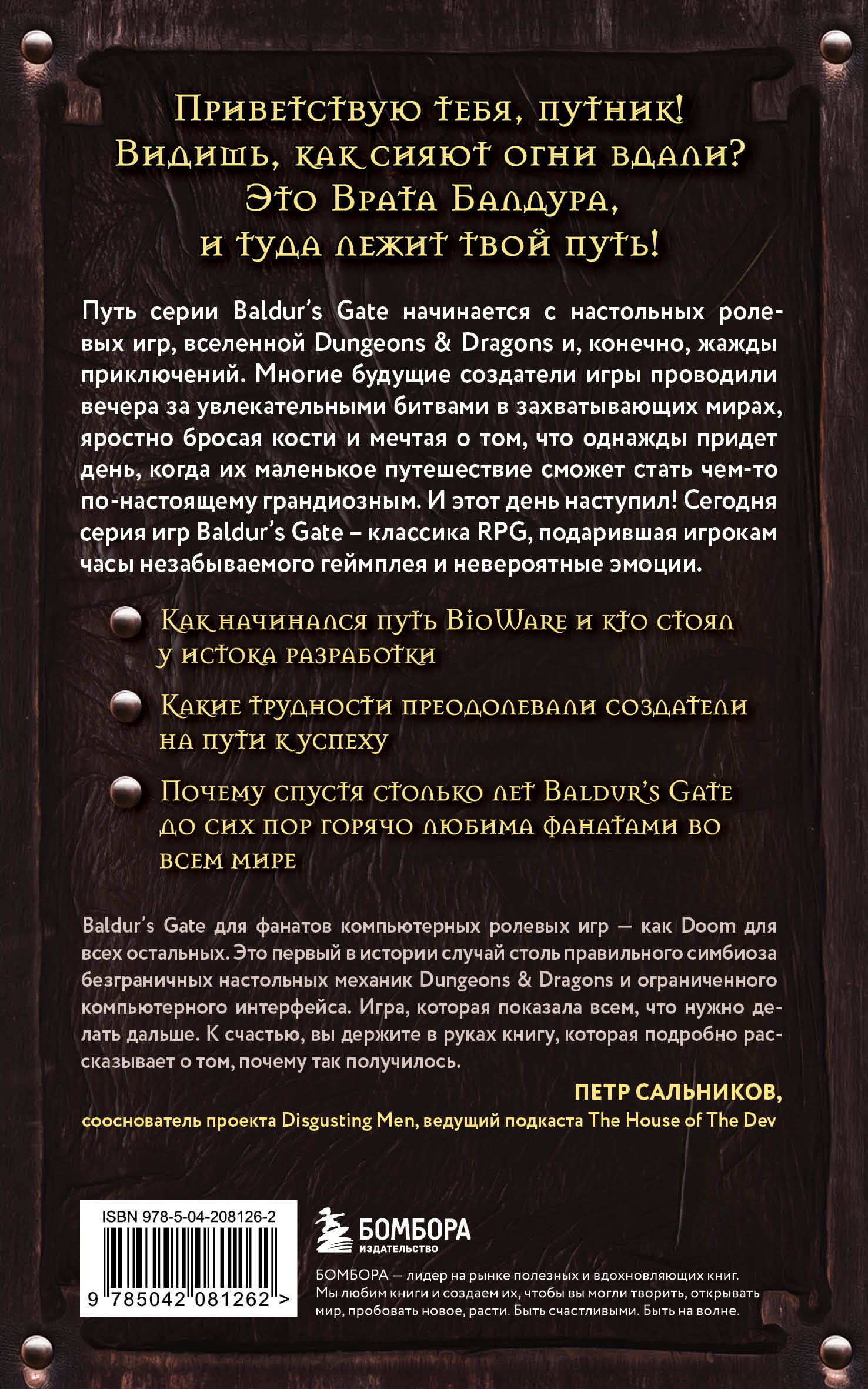 Приветствую тебя, путник! Видишь, как сияют огни вдали? Это Врата Балдура, и туда лежит твой путь! Путь серии Baldur's Gate начинается с настольных ролевых игр и вселенной Dungeons & Dragons и, конечно, жажды приключений. Многие будущие создатели игры проводили вечера за увлекательными битвами в захватывающих мирах, яростно бросая кости и мечтая о том, что однажды придет день, когда их маленькое путешествие сможет стать чем-то по-настоящему грандиозным. И этот день наступил! Сегодня серия игр Baldur's Gate - классика RPG, подарившая игрокам часы незабываемого геймплея и невероятные эмоции. Вы узнаете: - Как начинался путь BioWare и кто стоял у истоков разработки. - Какие трудности преодолевали создатели на пути к успеху. - Почему спустя столько лет Baldur's Gate до сих пор горячо любима фанатами во всем мире. «Baldur's Gate для фанатов компьютерных ролевых игр - как Doom для всех остальных. Это первый в истории случай столь правильного симбиоза безграничных настольных механик Dungeons & Dragons и ограниченного компьютерного интерфейса. Игра, которая показала всем, что нужно делать дальше. К счастью, вы держите в руках книгу, которая подробно рассказывает о том, почему так получилось». - ПЕТР САЛЬНИКОВ, сооснователь проекта Disgusting Men, ведущий подкаста The House of The Dev| Издательство | ООО "Издательство "Эксмо" |