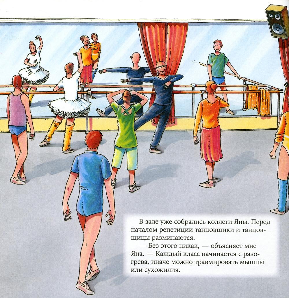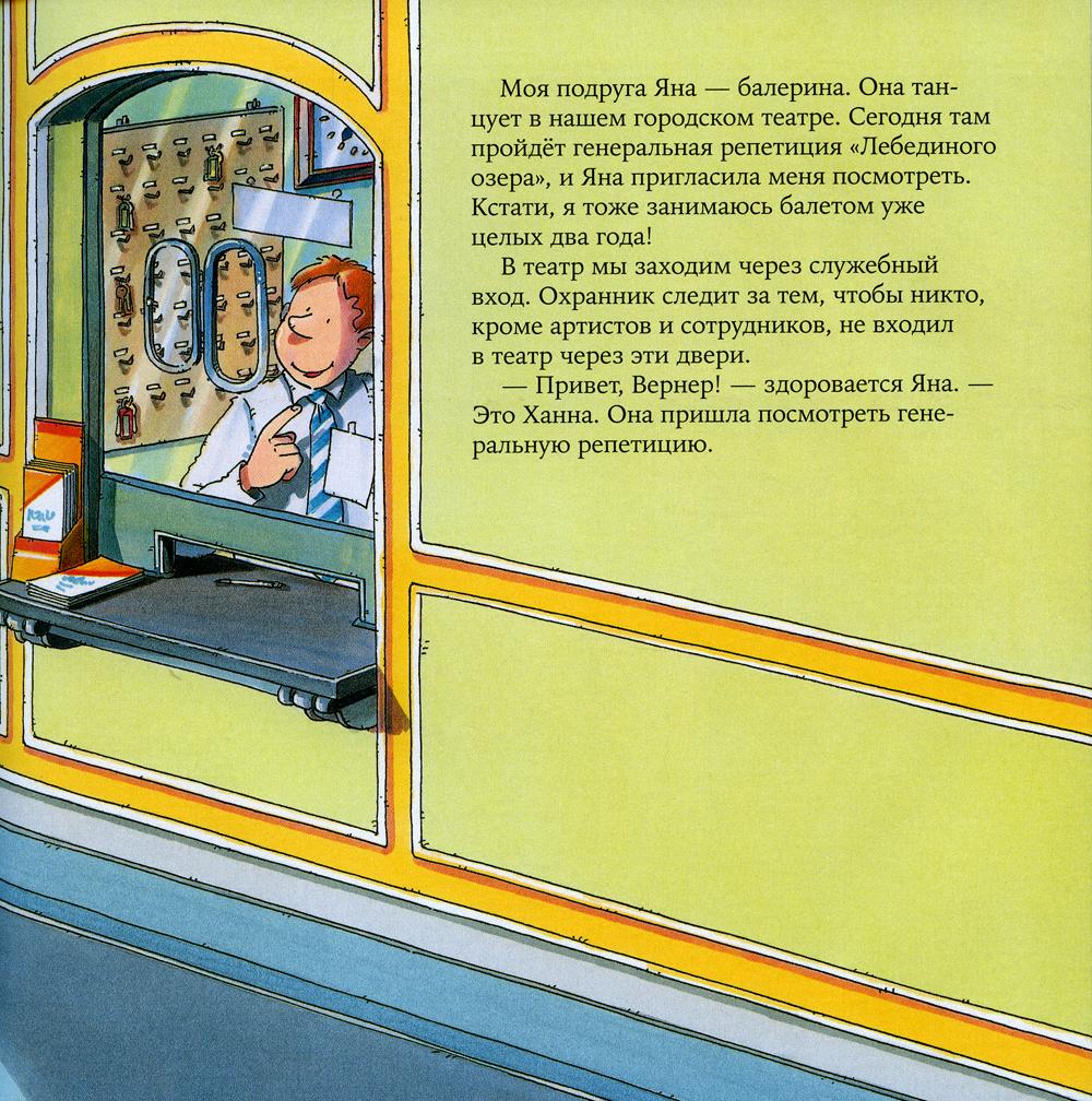 Все книги построены по принципу «один день из жизни...»: герои историй, дети, приходят в гости на работу к своим взрослым знакомым. В этой книге девочка Ханна попадает на генеральную репетицию в театре и узнаёт всё об интересной и непростой профессии балерины. Каждый день её подруга Яна усердно тренируется, чтобы уметь танцевать на кончиках пальцев и выполнять такие сложные движения, как жете, фуэте, арабеск и многие другие. Вместе с техниками, механиками сцены, костюмерами, дирижёрами, балетмейстерами артисты балета дарят зрителям возможность смотреть на прекрасное выступление.| Издательство | Альпина Паблишер |