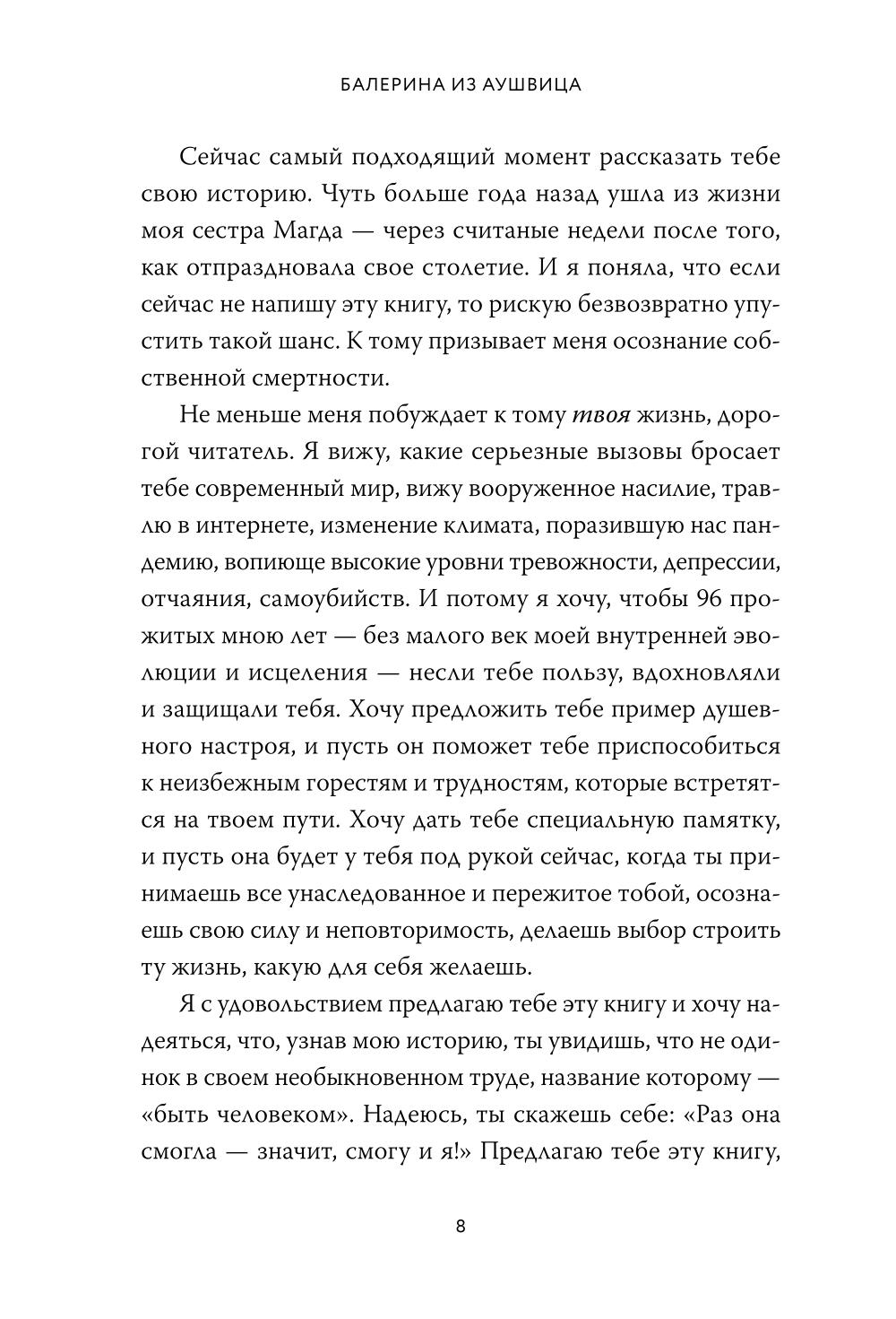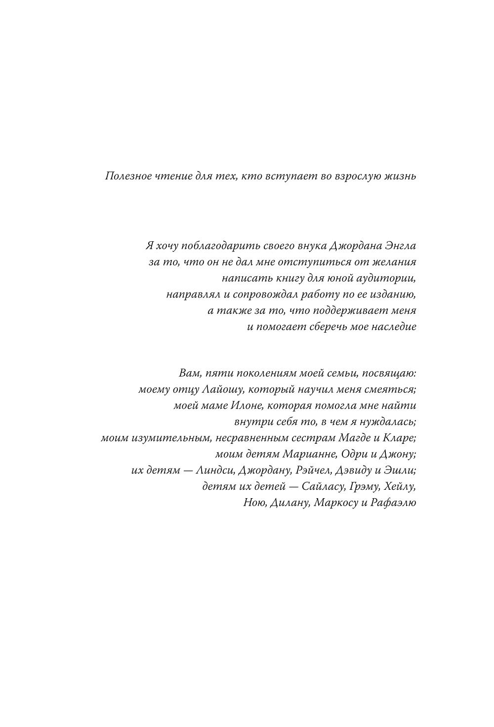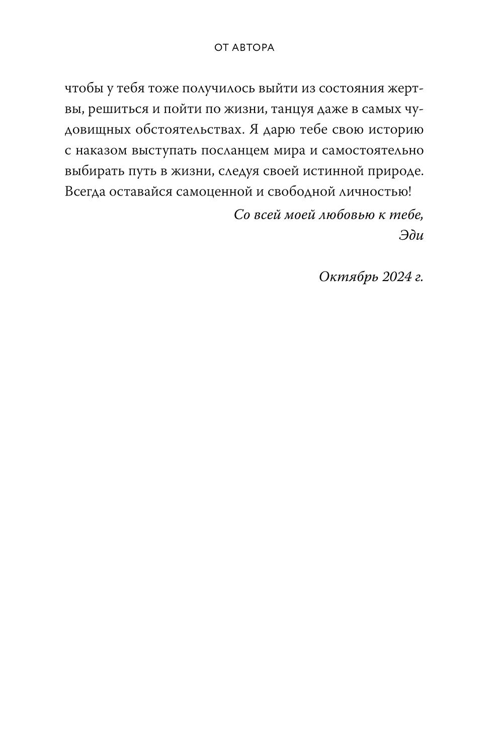 После международного успеха своих мемуаров «Выбор» о пребывании в Аушвице Эдит Эгер решила пересказать историю иначе. Так, чтобы ее услышали даже те, кому тяжело читать о холокосте. Это новая книга, созданная, чтобы вдохновлять, а не пугать. Эгер говорит голосом юной Эдит, влюбленной, мечтающей, ищущей себя. Откровенно и пронзительно, она заново по памяти воссоздает свое детство, первые чувства и чудо выживания в трагических условиях, делится собственными болью и надеждой. И вновь призывает: «Не так важен выбор, который сделала я шестнадцатилетняя, измученная голодом и ужасом, на пороге неизвестности. Не в моих силах изменить прошлое. Важен выбор, который я делаю сейчас, - принять себя такой, какая я есть, живым несовершенным человеческим существом, которому свойственно ошибаться. Принять ответственность за собственное счастье, продолжать жить и преуспевать, в каждое мгновение делая наш мир чуточку лучше».| Издательство | Манн, Иванов и Фербер |
