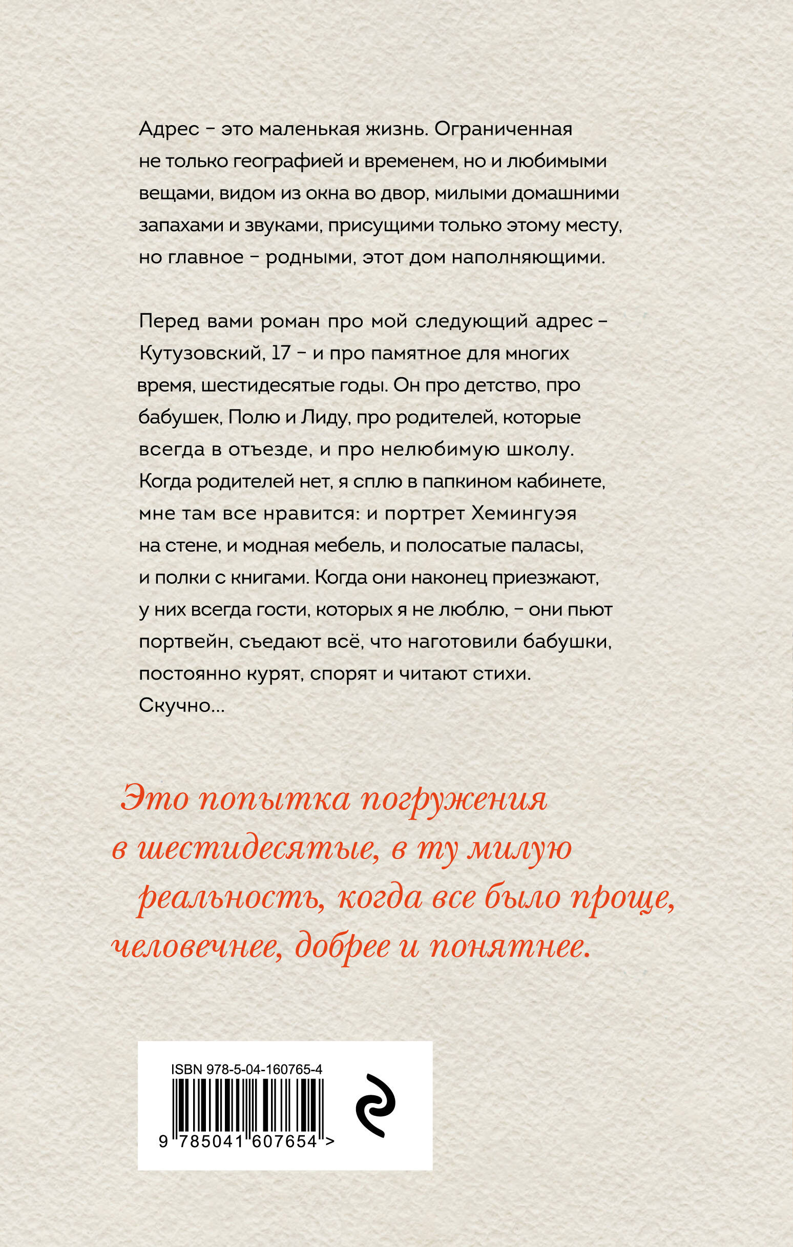 Адрес - это маленькая жизнь. Ограниченная не только географией и временем, но и любимыми вещами, видом из окна во двор, милыми домашними запахами и звуками, присущими только этому месту, но главное - родными, этот дом наполняющими. Перед вами новый роман про мой следующий адрес - Кутузовский, 17 - и про памятное для многих время, шестидесятые годы. Он про детство, про бабушек, Полю и Лиду, про родителей, которые всегда в отъезде, и про нелюбимую школу. Когда родителей нет, я сплю в папкином кабинете, мне там всё нравится - и портрет Хемингуэя на стене, и модная мебель, и полосатые паласы, и полки с книгами. Когда они наконец приезжают, у них всегда гости, которых я не люблю, - они пьют портвейн, съедают всё, что наготовили бабушки, постоянно курят, спорят и читают стихи. Скучно.... Это попытка погружения в шестидесятые, в ту милую реальность, когда все было проще, человечнее, добрее и понятнее. Для переиздания лучших книг прозы Рождественской мы создали новое, современной оформление. Оно сочетает в себе женственную мягкость урбанистических иллюстраций и мужскую четкость шрифтовых линий. Спешите собрать серию в новых обложках!| Издательство | Эксмо |