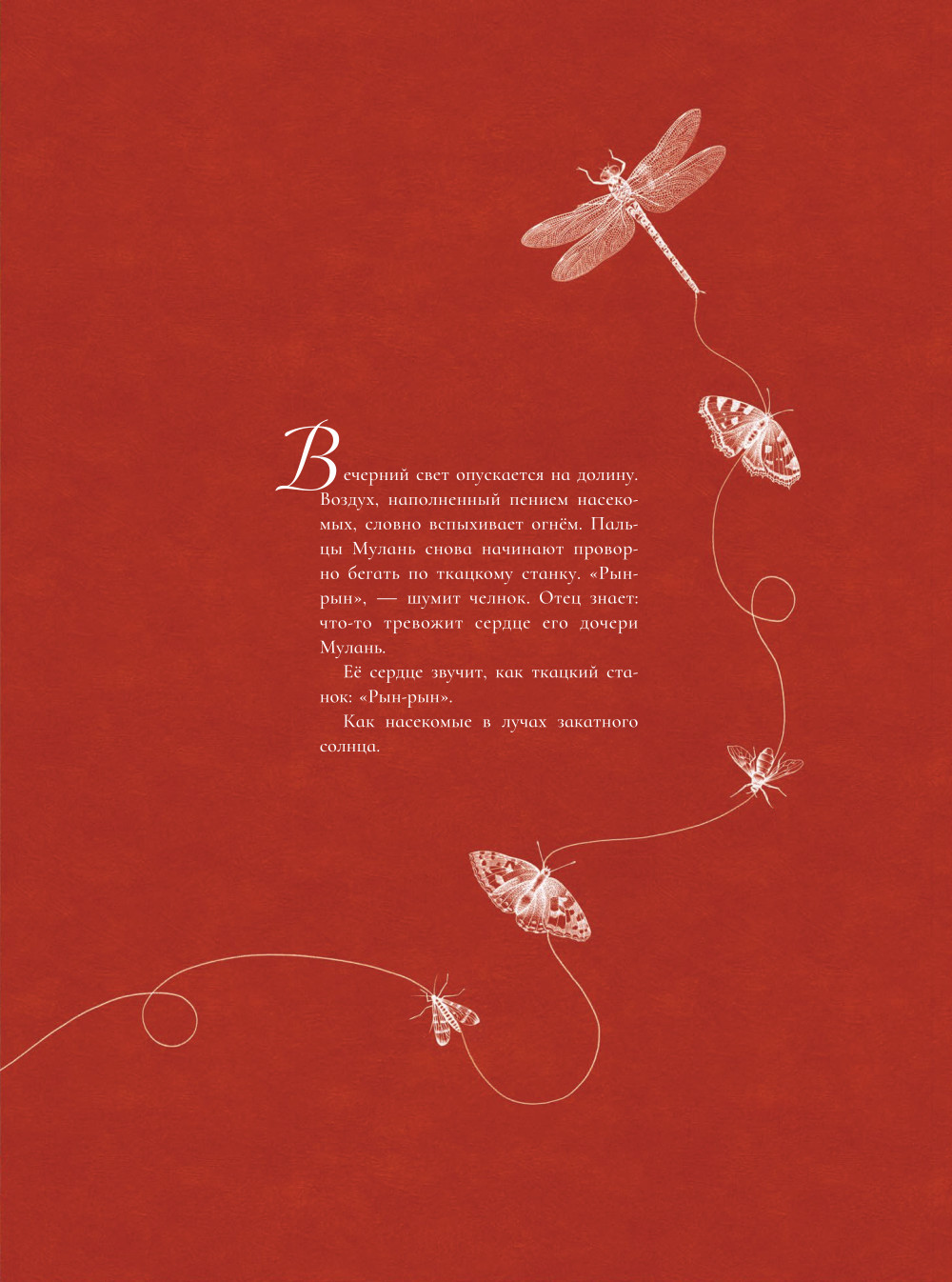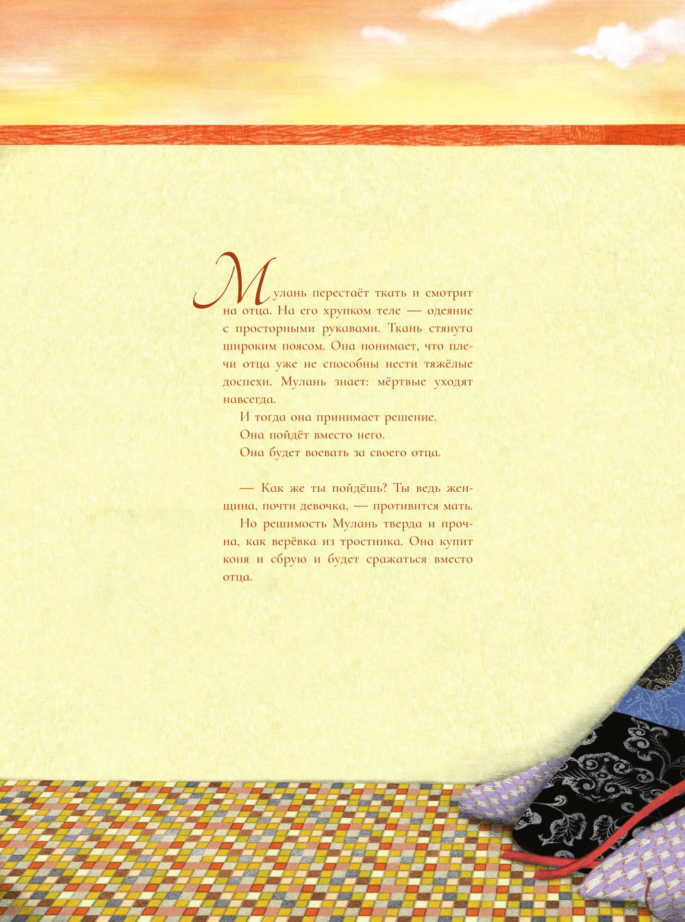 Когда Мулань узнала, что её престарелый отец получил приказ сражаться на войне, то очень расстроилась и, желая спасти отца от беды, решилась вступить в армию вместо него. Это красивое повествование о сильной и храброй женщине-воине, вдохновлённое китайской балладой XII века.| Издательство | Попурри |