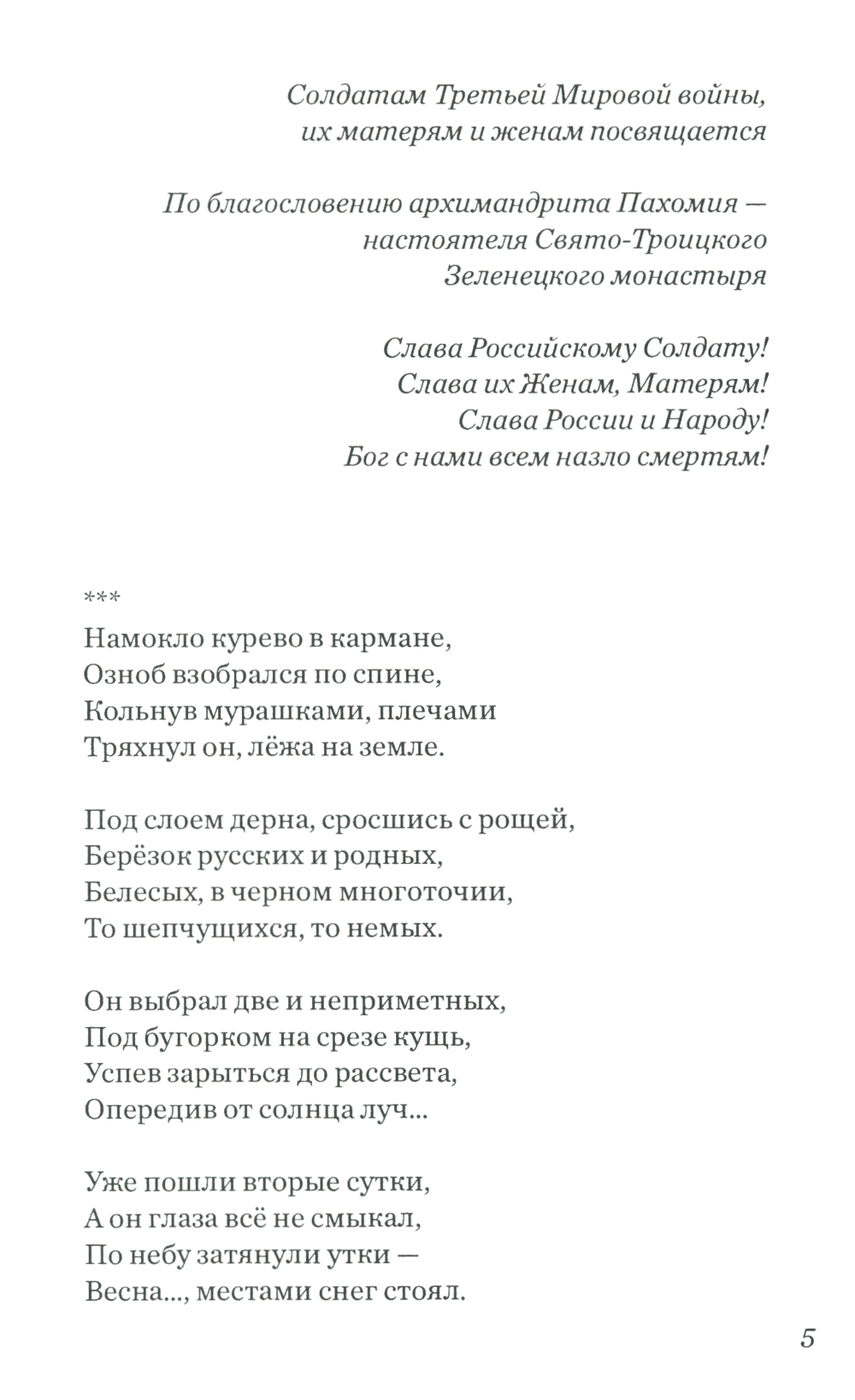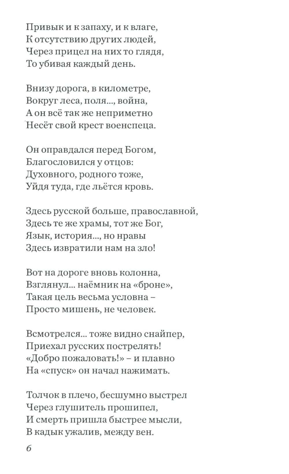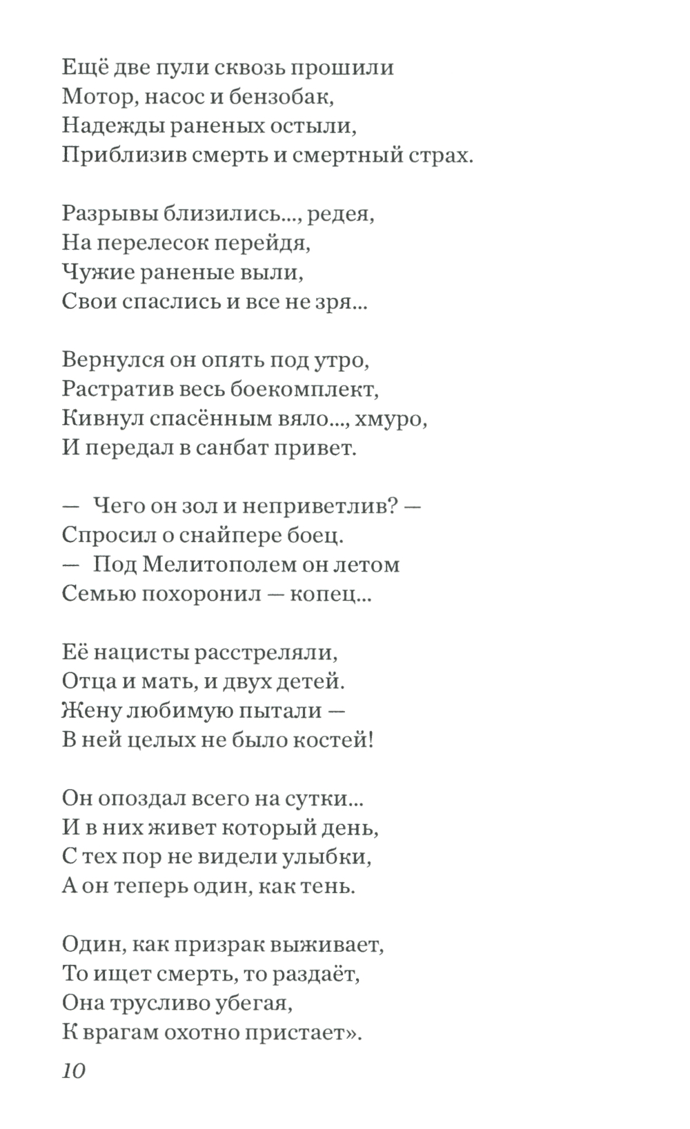 Фронтовая поэзия - особый жанр русского стихосложения нынешнего и предыдущих веков. В лирической форме драматической поэмы автор, прошедший суровую жизненную школу, выразил надежды и чаяния солдата-снайпера, сражающегося на фронте за спасение России. Специальная военная операция, каки в годы Великой Отечественной войны, сплотила русский российский народ на борьбу с безжалостным иноземным врагом - с «либеральной» антицивилизацией Запада.| Издательство | Книжный мир |