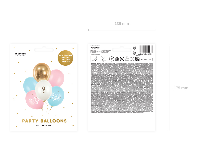 Strong Balloons Boy or Girl with print, set contains 6 balloons (1 in pastel Light Blue colour with white and gold print, 1 in pastel Pale Pink colour with white and gold print, 1 in pastel Pure White colour with gold print, 1 in pastel Light Blue colour, 1 in pastel Pale Pink colour and 1 in Glossy gold colour), diameter approx. 30 cm.