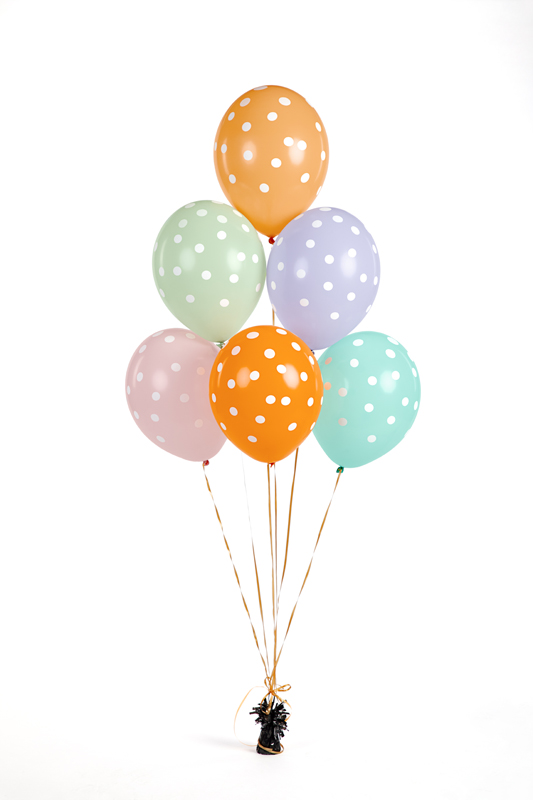 Strong balloons Dots with print, set contains 6 balloons (1 in pastel Mandarin Orange with white print, 1 in pastel Light Mint colour with white print, 1 in pastel Light Lilac colour with white print, 1 in pastel Bright Orange colour with white print, 1 in pastel Pistachio colour with white print and 1 in pastel Pale Pink colour with white print), diameter approx. 30 cm.