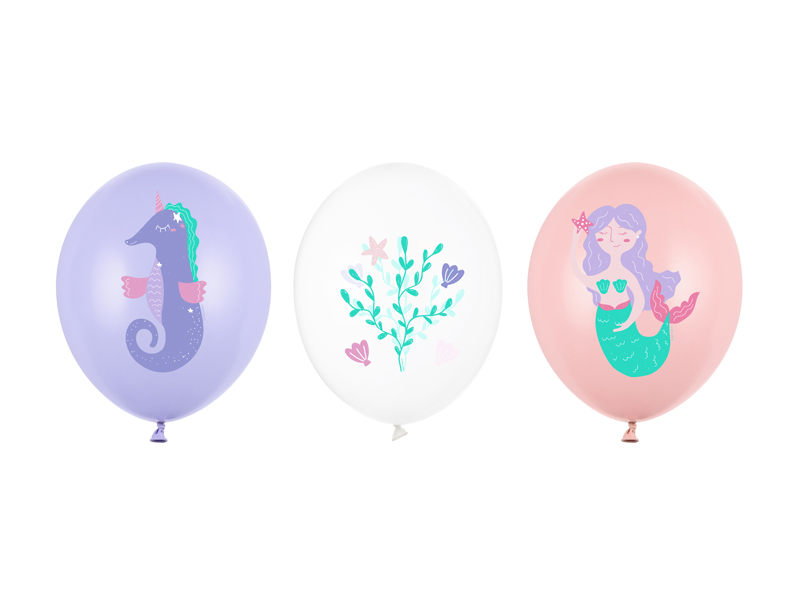 Strong balloons Sea World with print, set contains 3 designs: Crystal Clear with colorful print, pastel in Pale Pink colour with colorful print and pastel in Light Lilac colour with colorful print, diameter approx. 30 cm.<BR>(1 pkt / 50 pc.)