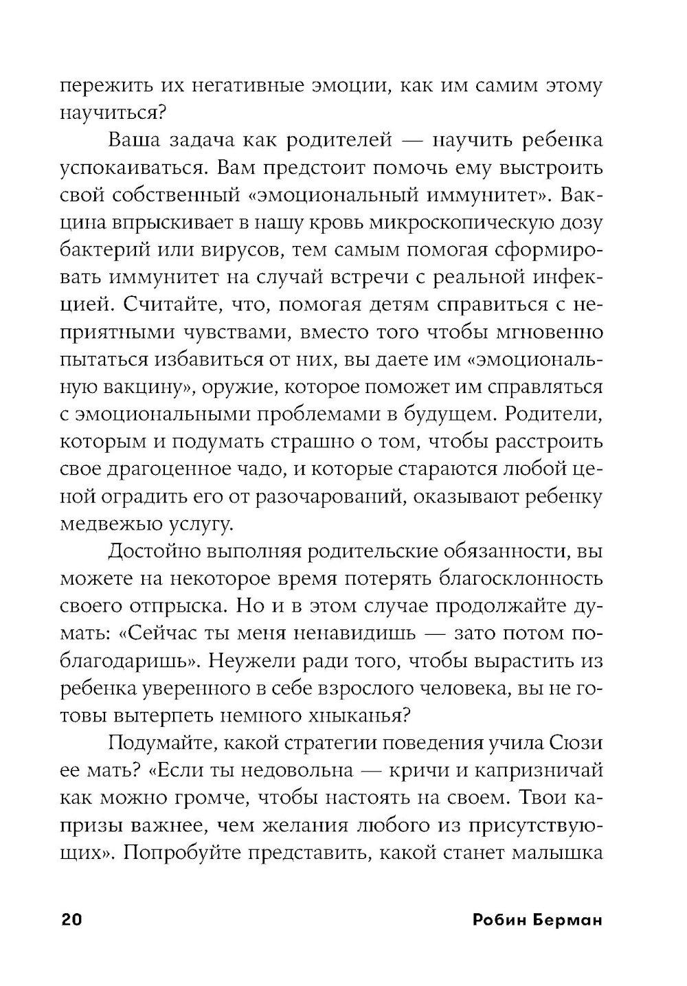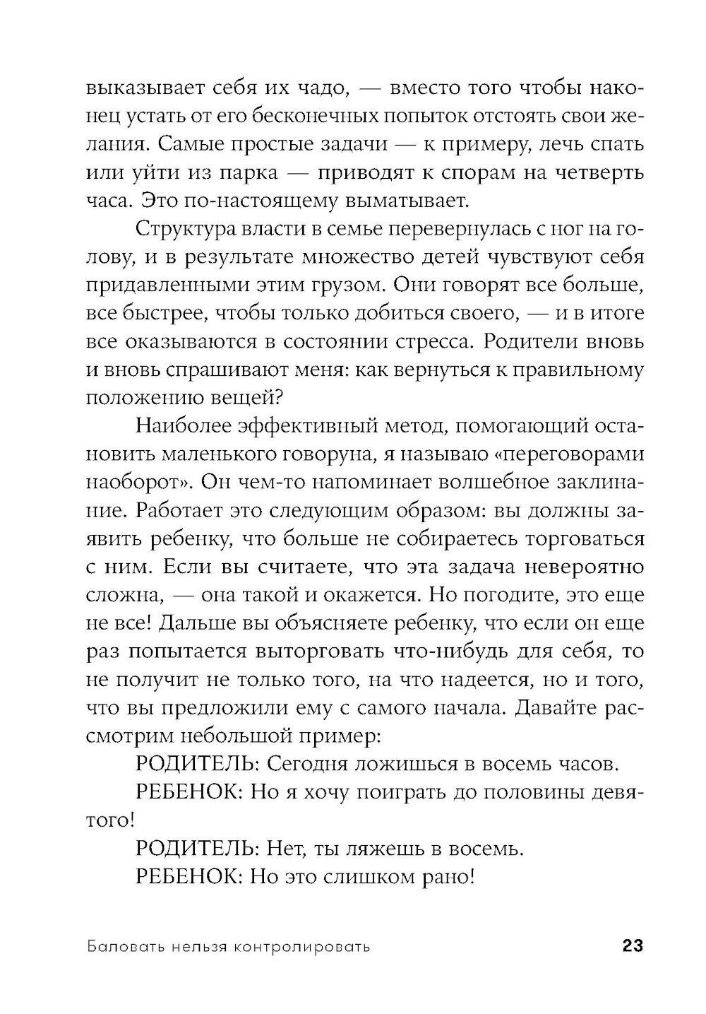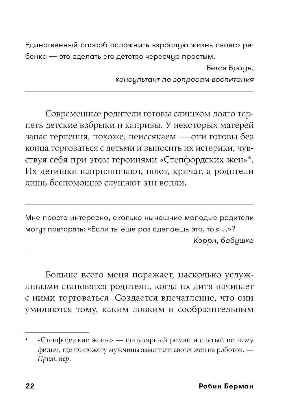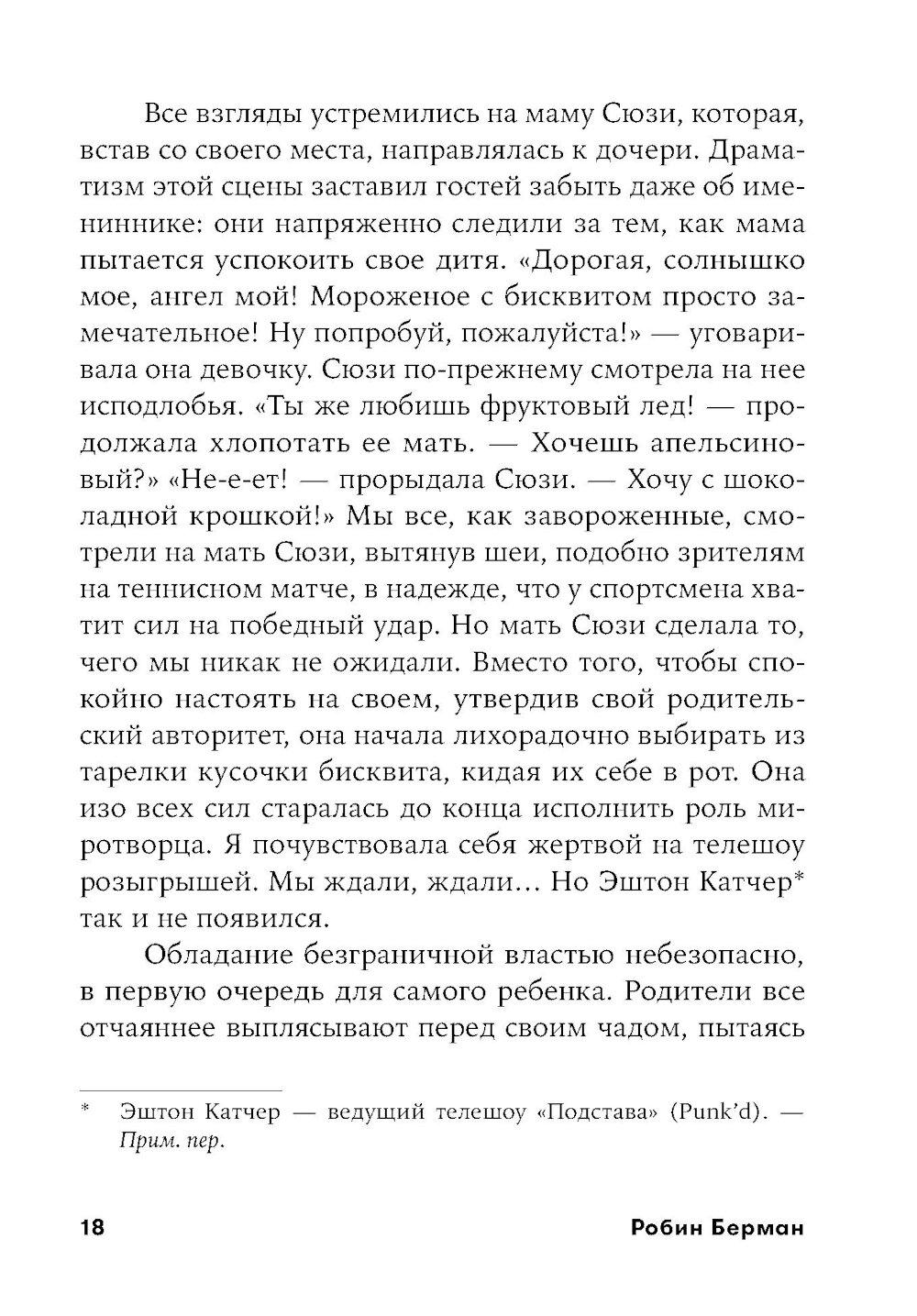 Современные родители впали в очередную педагогическую крайность: сегодня считается правильным всячески баловать, поощрять детей, одобрять каждый их шаг и ни в коем случае не ругать и не огорчать. Звучит вроде бы неплохо, однако на деле такой подход угрожает психологическому здоровью будущих поколений не меньше, чем родительская тирания, общепринятая для прошлых десятилетий. Избалованные, не привыкшие к самостоятельности дети вырастают инфантильными и фактически незрелыми личностями.| Издательство | Альпина Паблишер |