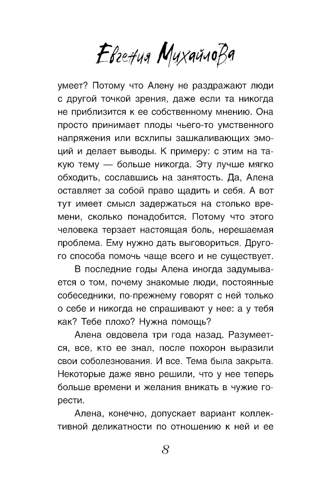 Лариса всю свою жизнь мечтала найти идеального мужа, и ей в этом повезло. Но вскоре у Лары возникли сомнения в искренности избранника, и частный детектив подтвердил ее худшие опасения... У писательницы Марины много поклонников, но завелись и враги. Кто желает ей смерти и вполне способен добиться своей цели? Это может выяснить только опытный специалист по расследованиям... Первокурсница Ира стала свидетелем похищения подруги Даши. По счастью, у нее оказалась визитка с телефоном нового участкового, а тот хорошо знаком с частным сыщиком... Детектив Сергей Кольцов - последняя надежда тех, кто уже почти не верит в свое спасение. Герои остросюжетных рассказов Евгении Михайловой по-разному понимают справедливость, но готовы ради нее пойти на риск. Им приходится столкнуться с подлостью и предательством самых близких людей, но они, несмотря ни на что, находят в себе душевные силы противостоять злу и выйти из схватки с ним победителями. Герои этих новелл - обычные люди, они беспомощны, беззащитны и поодиночке пропадут, но могут помочь друг другу в схватке с несправедливостью.