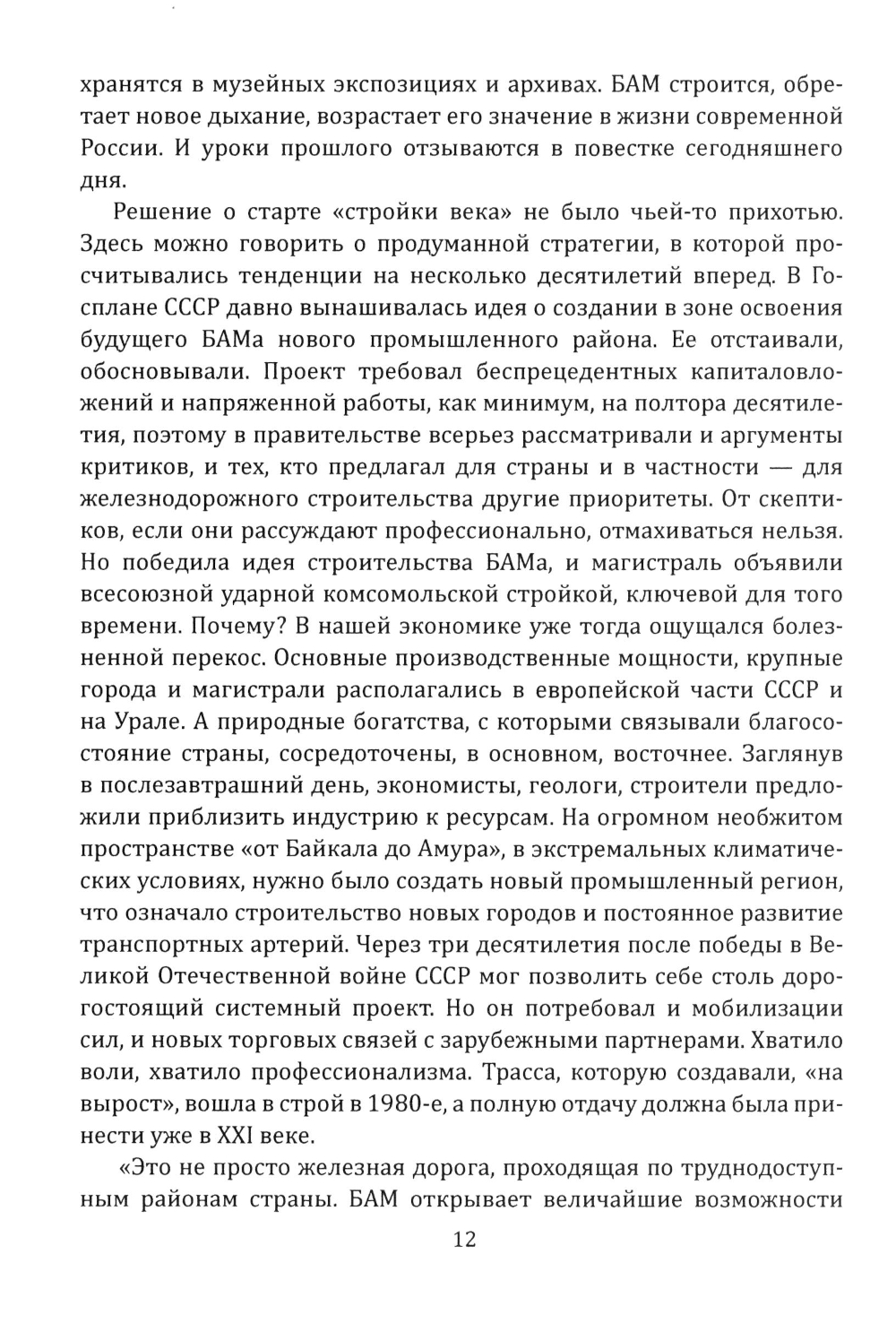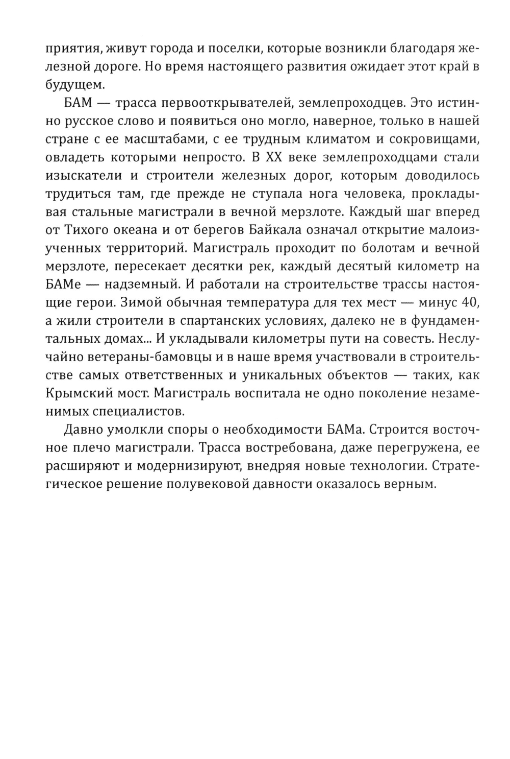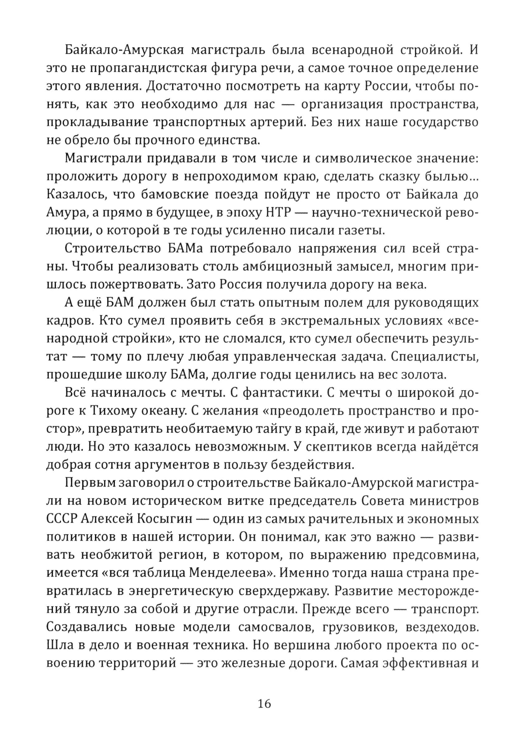 БАМ - последняя и самая грандиозная из великих строек социализма. Ее форсированное строительство началось в 1974 году и продолжалось 10 лет. В это время советские люди ежедневно слушали репортажи с Магистрали и песни, в которых прославлялись герои БАМа. Бамовцы пробивались в тайгу, упокоряли вечную мерзлоту, возводили города и заводы. В этой книге рассказано о строителях Магистрали - от глав государства до знаменитых бригадиров и рабочих. Перед вами пройдет вся история БАМа - от жертвенных подвигов изыскателей до модернизации, которая проходит в наше время. Время доказало, что БАМ необходим России. И как связующее звено в Китаем, и как основа будущей важной экономической зоны. Ведь в окрестностях Магистрали спрятана «вся таблица Менделеева». Поэтому БАМ - это больше, чем железнодорожная трасса, а феномен, который нужно изучать с разных сторон. Ему и посвящена эта книга.| Издательство | Родина |