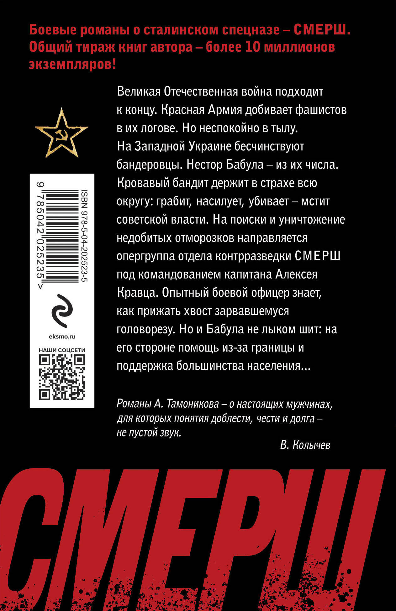 Самые интересные романы о сталинском спецназе - СМЕРШе. Великая Отечественная война подходит к концу. Красная Армия добивает фашистов в их логове. Но неспокойно в тылу. На Западной Украине бесчинствуют бандеровцы. Нестор Бабула - из их числа. Кровавый бандит держит в страхе всю округу: грабит, насилует, убивает - мстит за советскую власть. На поиски и уничтожение недобитых отморозков направляется опергруппа отдела контрразведки СМЕРШа под командованием капитана Алексея Кравца. Опытный боевой офицер знает, как прижать хвост зарвавшемуся головорезу. Но и Бабула не лыком шит: на его стороне помощь из-за границы и поддержка большинства населения... «Смерть шпионам!» (СМЕРШ) - это короткое и беспощадное название носило особое подразделение НКВД, подчинявшееся И. Сталину. Созданное в годы войны, оно состояло из проверенных в бою, честных и бесстрашных офицеров Красной Армии. СМЕРШа боялись все - и фашистские лазутчики, готовящие диверсии в наших боевых порядках, и гитлеровские приспешники, действующие в глубоком советском тылу. Враг знал: если на его след напали бойцы сталинского спецназа, справедливого и скорого суда не избежать. Романы серии «СМЕРШ - спецназ Сталина» - это каждый раз увлекательный динамичный сюжет и новые исторические знания, это экшен, написанный простым и понятным языком. Общий тираж книг А. Тамоникова - более 10 миллионов экземпляров! «Романы А. Тамоникова - о настоящих мужчинах, для которых понятия доблести, чести и долга - не пустой звук». - В. Колычев| Издательство | ООО "Издательство "Эксмо" |