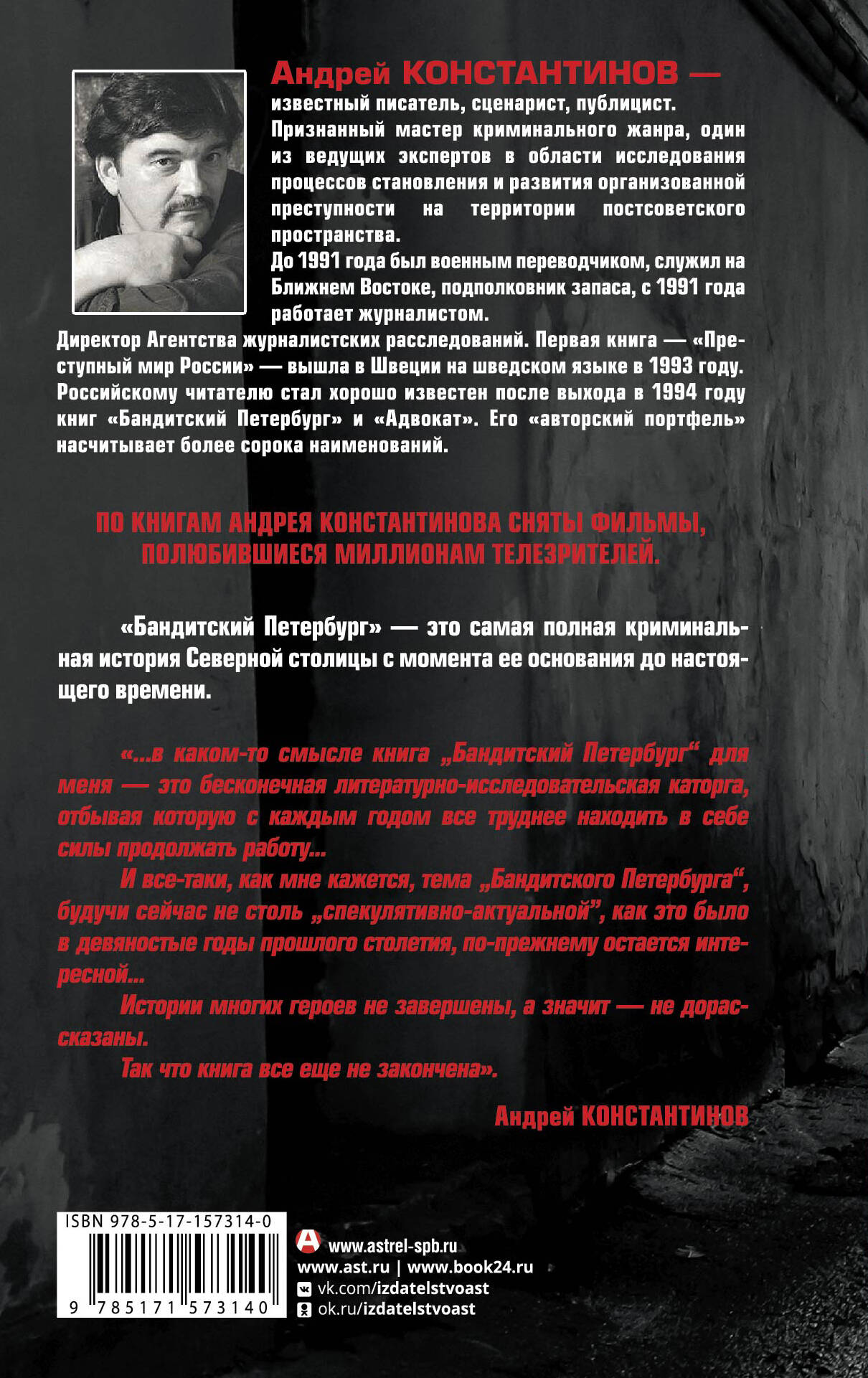 "Бандитский Петербург" - это самая полная криминальная история Северной столицы с момента ее основания до настоящего времени. "...в каком-то смысле книга "Бандитский Петербург" для меня - это бесконечная литературно-исследовательская каторга, отбывая которую с каждым годом все труднее находить в себе силы продолжать работу... И все-таки, как мне кажется, тема "Бандитского Петербурга", будучи сейчас не столь "спекулятивно-актуальной", как это было в девяностые годы прошлого столетия, по-прежнему остается интересной... Истории многих героев не завершены, а значит - не дорассказаны. Так что книга все еще не закончена". Андрей Константинов