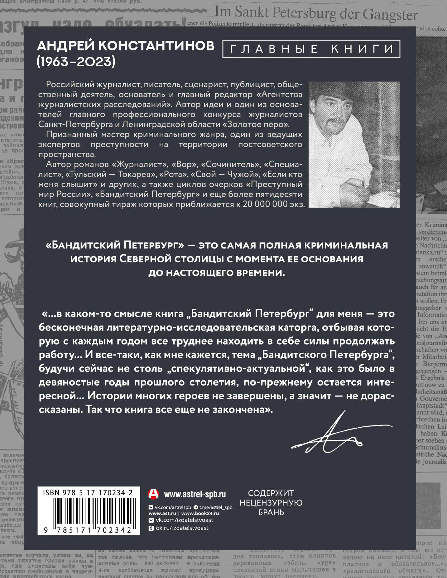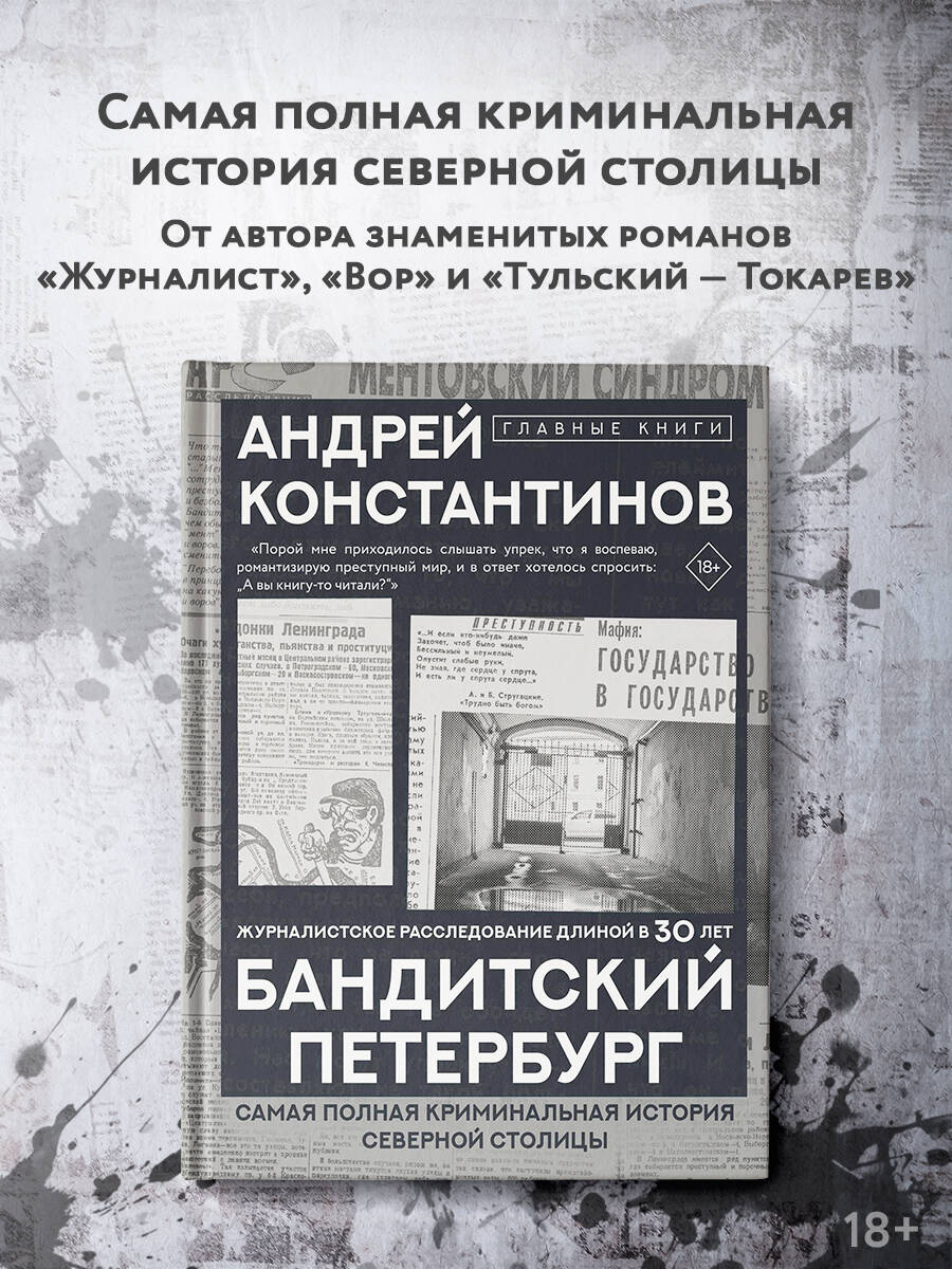 РУССКИЙ ТРУ-КРАЙМ С ТИРАЖОМ БОЛЕЕ 1 000 000 ЭКЗЕМПЛЯРОВ. ЖУРНАЛИСТСКОЕ РАССЛЕДОВАНИЕ ДЛИНОЙ В 30 ЛЕТ. САМАЯ ПОЛНАЯ КРИМИНАЛЬНАЯ ИСТОРИЯ СЕВЕРНОЙ СТОЛИЦЫ. Андрей Константинов (1963-2023) - российский журналист, писатель, сценарист, публицист, общественный деятель, основатель и главный редактор "Агентства журналистских расследований". Признанный мастер криминального жанра, один из ведущих экспертов преступности на территории постсоветского пространства. Автор не только популярнейших криминальных романов, таких как "Журналист", "Вор", "Сочинитель", "Специалист", "Тульский - Токарев", "Рота", "Свой - Чужой", "Если кто меня слышит" и других, но и нонфикшн-изданий. Среди них - учебник "Журналистское расследование. История метода и современная практика", в котором раскрываются основные вопросы методики журналистского расследования, и главное документальное исследование автора - книга "Бандитский Петербург", которую Андрей Константинов писал и дополнял на протяжении тридцати лет. "...в каком-то смысле книга "Бандитский Петербург" для меня - это бесконечная литературно-исследовательская каторга, отбывая которую с каждым годом все труднее находить в себе силы продолжать работу... И все-таки, как мне кажется, тема "Бандитского Петербурга", будучи сейчас не столь "спекулятивно-актуальной", как это было в девяностые годы прошлого столетия, по-прежнему остается интересной... Истории многих героев не завершены, а значит - не дорассказаны. Так что книга все еще не закончена". А. Константинов| Издательство | Издательство "АСТ" |
