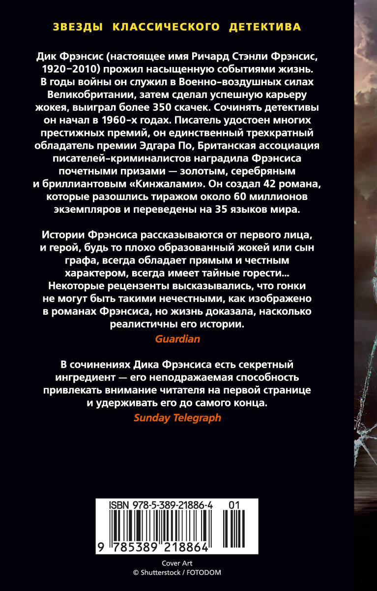 Дик Фрэнсис (1920-2010) - один из самых именитых английских авторов, писавших в жанре детектива. За свою жизнь он создал более 30 бестселлеров, получивших международное признание. Его романы посвящены преимущественно миру скачек - Фрэнсис знал его не понаслышке, ведь он родился в семье жокея и сам был знаменитым жокеем. Этот мир полон азарта, здесь кипят нешуточные страсти вокруг великолепных лошадей и крупных ставок в тотализаторах, здесь есть чем поживиться мошенникам. Все это и послужило материалом для произведений Фрэнсиса. Чутье на выгодные инвестиции - вот что необходимо банкиру. И еще немного удачи... Тимоти Эктрин, правнук основателя крупного банка, принял решение ссудить деньги владельцу конного завода на приобретение чистокровного скакуна-чемпиона, продажа потомства которого обещает стать весьма прибыльным делом. Но что-то явно идет не так, и молодой банкир оказывается втянутым в круговорот необъяснимых и опасных событий...| Издательство | Азбука-Аттикус Издат.группа ООО |