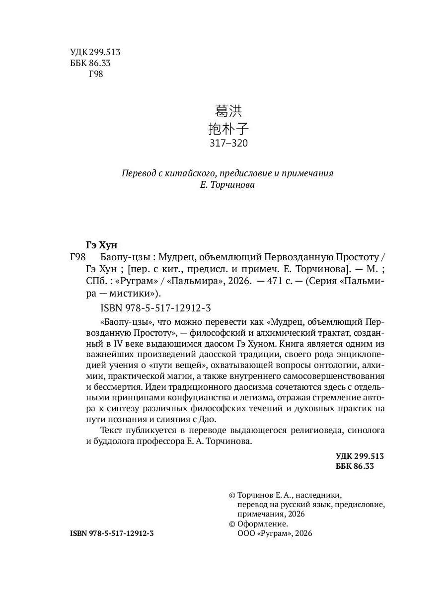 «Баопу-цзы», что можно перевести как «Мудрец, объемлющий Первозданную Простоту», - философский и алхимический трактат, созданный в IV веке выдающимся даосом Гэ Хуном. Книга является одним из важнейших произведений даосской традиции, своего рода энциклопедией учения о «пути вещей», охватывающей вопросы онтологии, алхимии, практической магии, а также внутреннего самосовершенствования и бессмертия. Идеи традиционного даосизма сочетаются здесь с отдельными принципами конфуцианства и легизма, отражая стремление автора к синтезу различных философских течений и духовных практик на пути познания и слияния с Дао. Текст публикуется в переводе выдающегося религиоведа, синолога и буддолога профессора Е. А. Торчинова.| Издательство | Т8 RUGRAM |