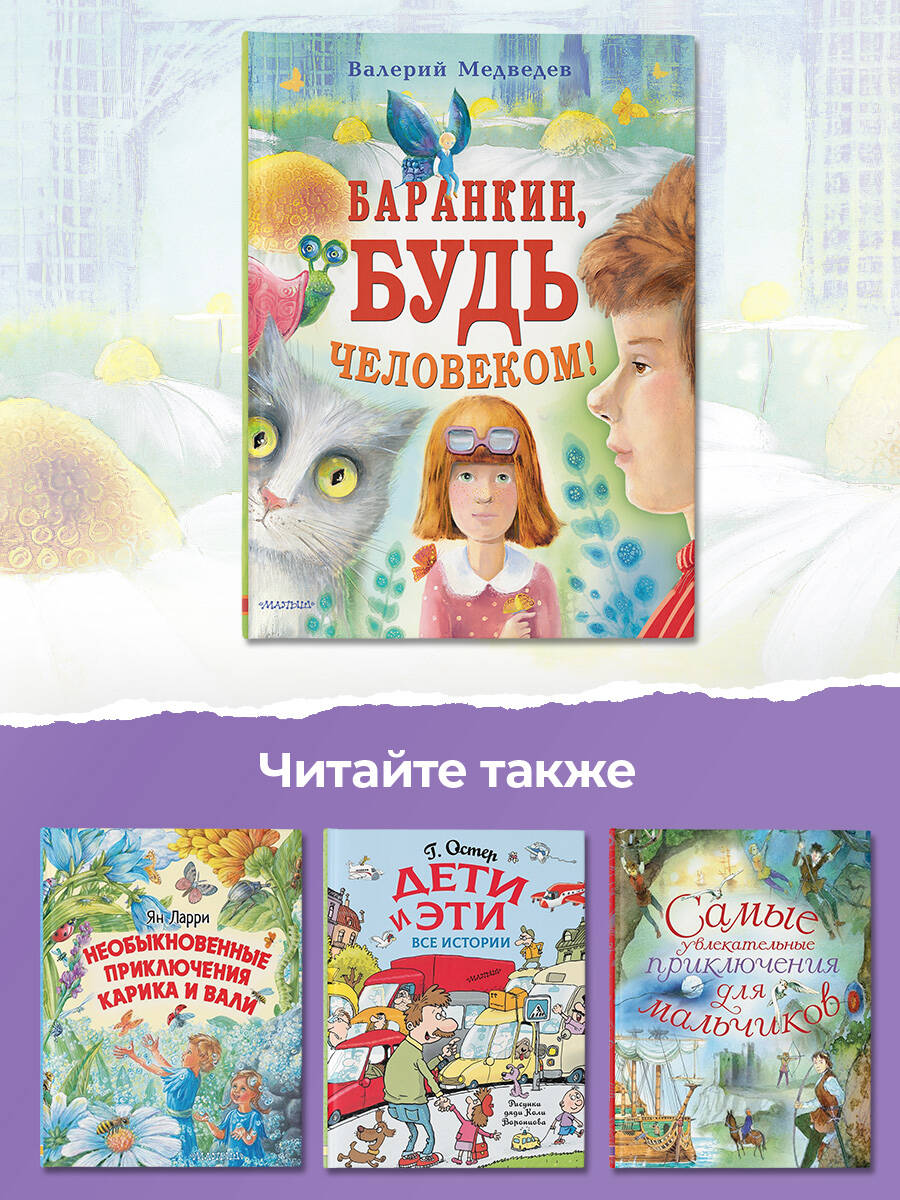 Валерий Владимирович Медведев (1923 -1997) - русский советский писатель. В 1962 г. вышла сказочная повесть "Баранкин, будь человеком!" и сразу же прославила автора. В 1963 г. вышел знаменитый мультфильм по одноименной повести. И в том же году на ХV Фестивале фильмов для детей и юношества в Венеции мультфильм "Баранкин, будь человеком!" получил бронзовую медаль. В. Медведев - лауреат премии Международного конкурса им. Х.К. Андерсена. Повесть "Баранкин, будь человеком!" переведена на 28 языков мира. Иллюстрации Кати Костиной. Для младшего школьного возраста.