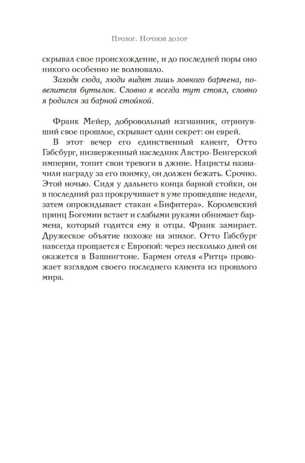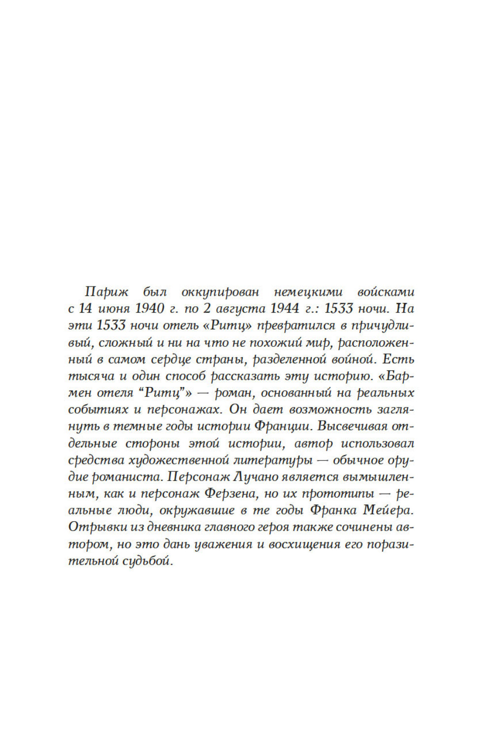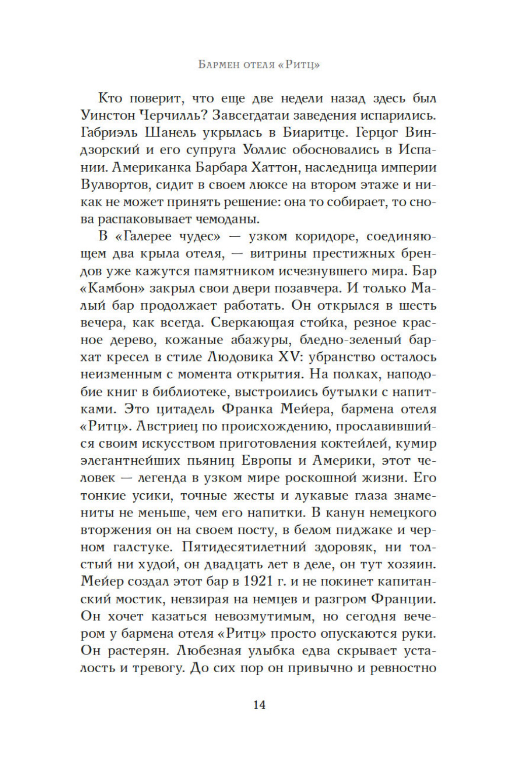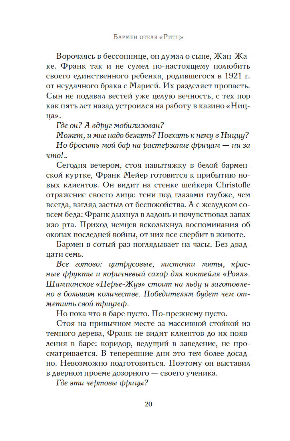 Июнь 1940 года. Немцы входят в Париж. Везде действует строгий комендантский час, за исключением гранд отеля Ритц. Жаждущие познакомиться с искусством жить по-французски, обитатели отеля встречаются с парижской элитой, а за барной стойкой работает Франк Мейер, крупнейший бармен в мире. Адаптация это вопрос выживания. Франк Мейер оказывается искусным дипломатом, завоевывает симпатии немецких офицеров. В течение четырех лет люди из гестапо будут пить за Коко Шанель, ужасную вдову Ритц или Саша Гитри. Мужчины и женщины, коллаборационисты и участники сопротивления, герои и доносчики, будут любить друг друга, предавать друг друга, и бороться за желанную идею миропорядка. Большинство из них не знает, что Франк Мейер, австрийский эмигрант, ветеран войны 1914 года, скрывает тайну. Бармен отеля «Ритц» - еврей.| Издательство | КоЛибри |