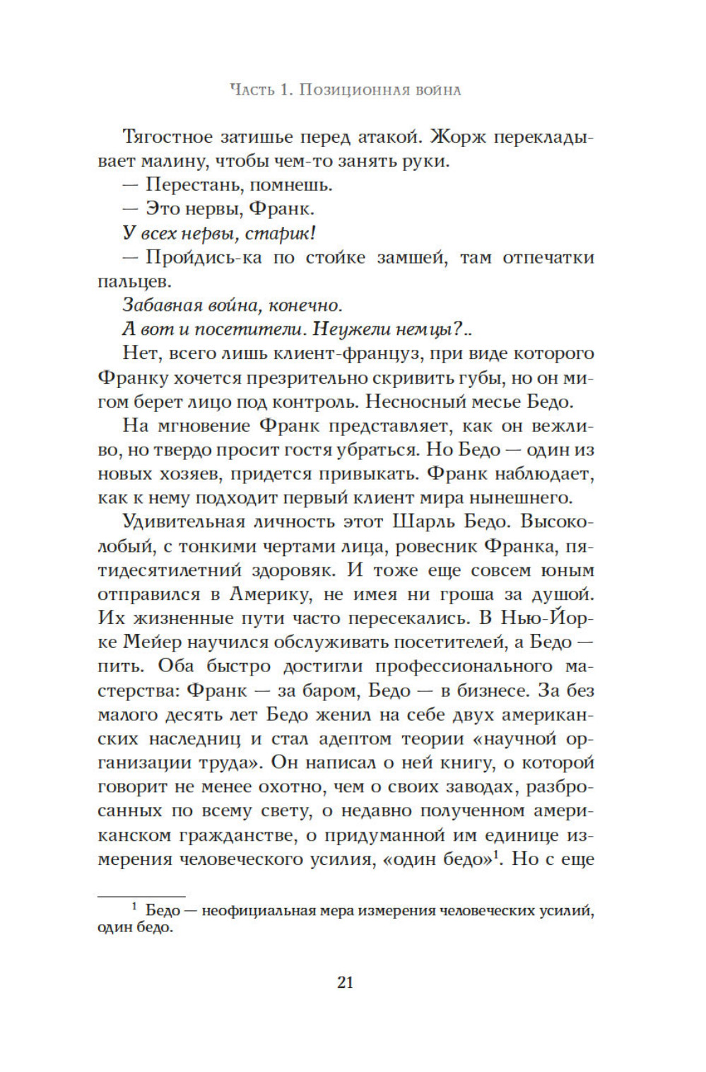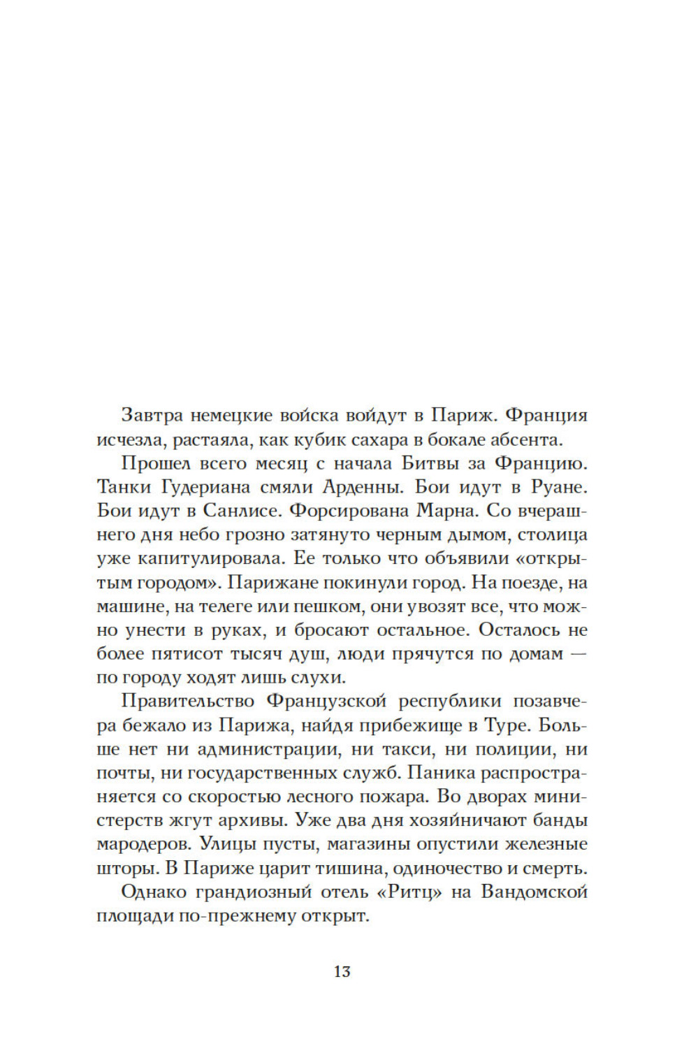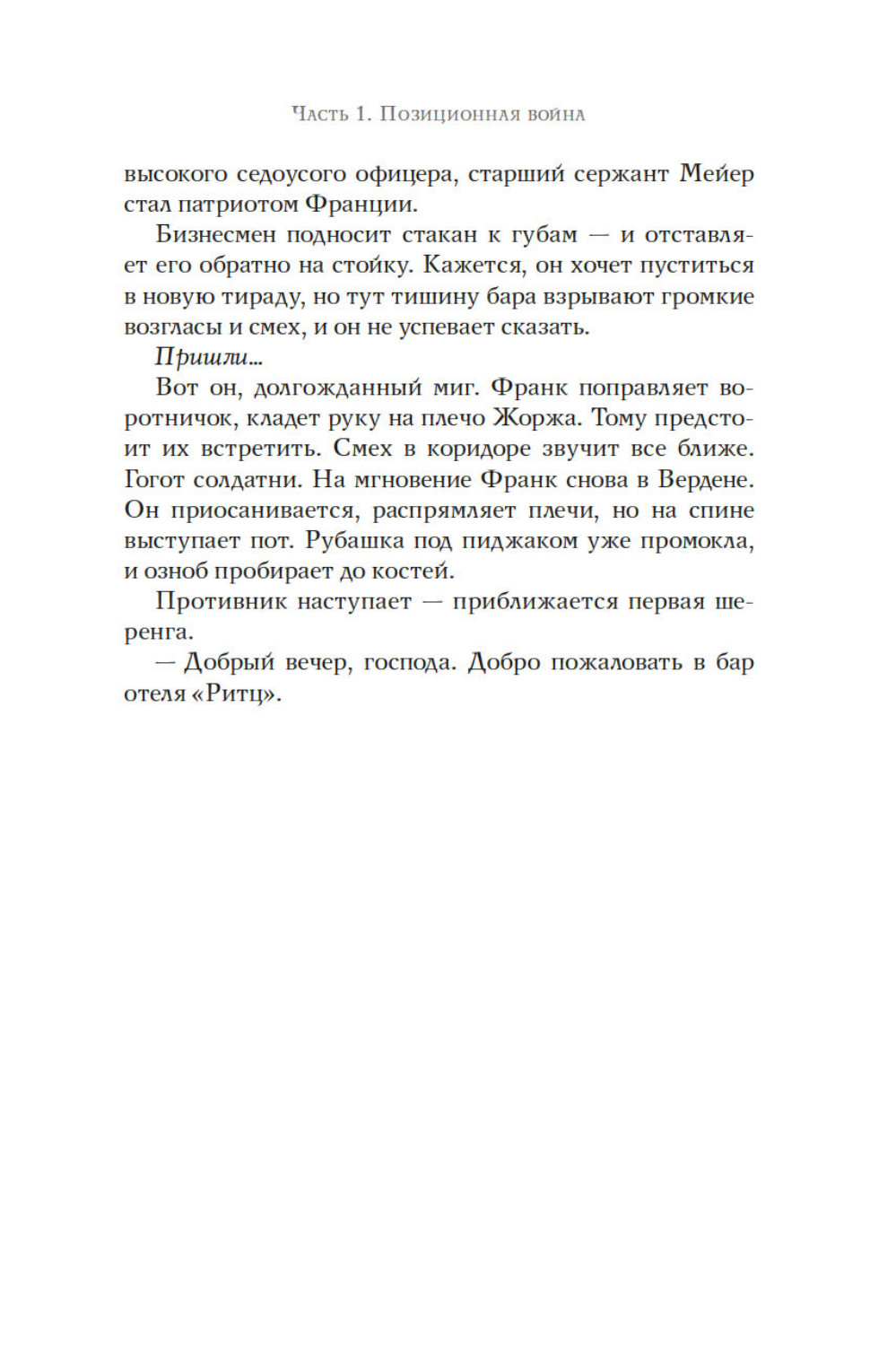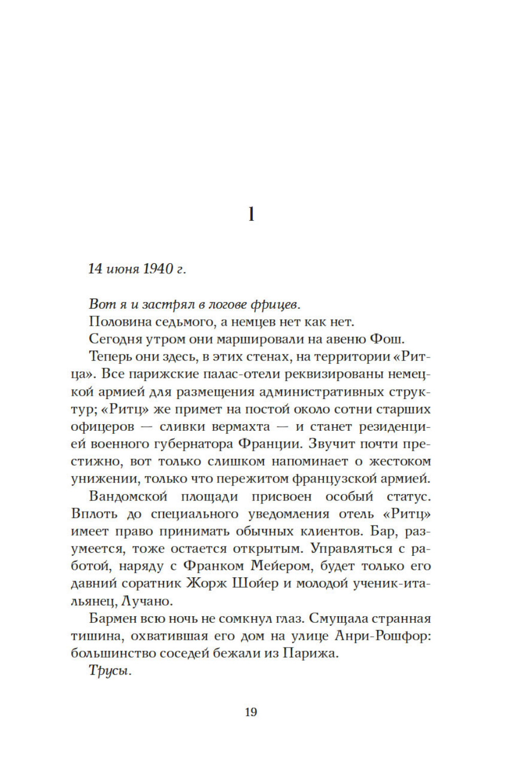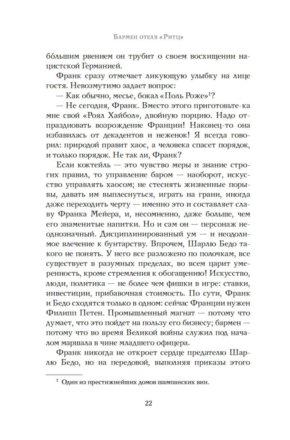Июнь 1940 года. Немцы входят в Париж. Везде действует строгий комендантский час, за исключением гранд отеля Ритц. Жаждущие познакомиться с искусством жить по-французски, обитатели отеля встречаются с парижской элитой, а за барной стойкой работает Франк Мейер, крупнейший бармен в мире. Адаптация это вопрос выживания. Франк Мейер оказывается искусным дипломатом, завоевывает симпатии немецких офицеров. В течение четырех лет люди из гестапо будут пить за Коко Шанель, ужасную вдову Ритц или Саша Гитри. Мужчины и женщины, коллаборационисты и участники сопротивления, герои и доносчики, будут любить друг друга, предавать друг друга, и бороться за желанную идею миропорядка. Большинство из них не знает, что Франк Мейер, австрийский эмигрант, ветеран войны 1914 года, скрывает тайну. Бармен отеля «Ритц» - еврей.| Издательство | КоЛибри |