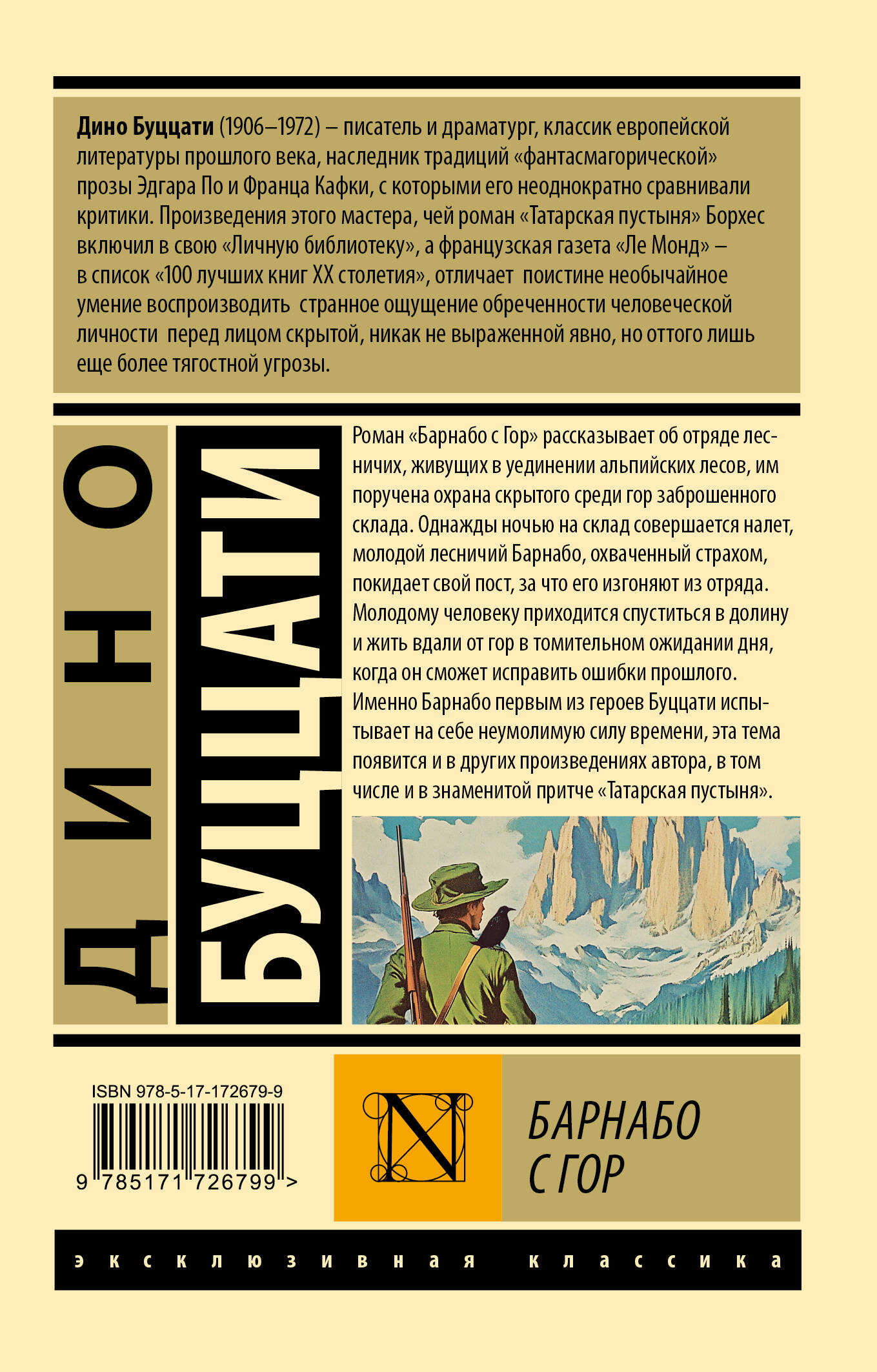- Дино Буццати - известный итальянский писатель, журналист и драматург, автор книг «Загадка старого леса» и «Татарская пустыня». Творчество Буццати часто сравнивают с По, Кафкой, Камю и Сартром. - «Барнабо с гор» - дебютный роман автора. - На русском языке «Барнабо с гор» публикуется впервые. - Издание в серии «Эксклюзивная классика» - в удобном карманном формате и узнаваемом оформлении.| Издательство | Издательство "АСТ" |