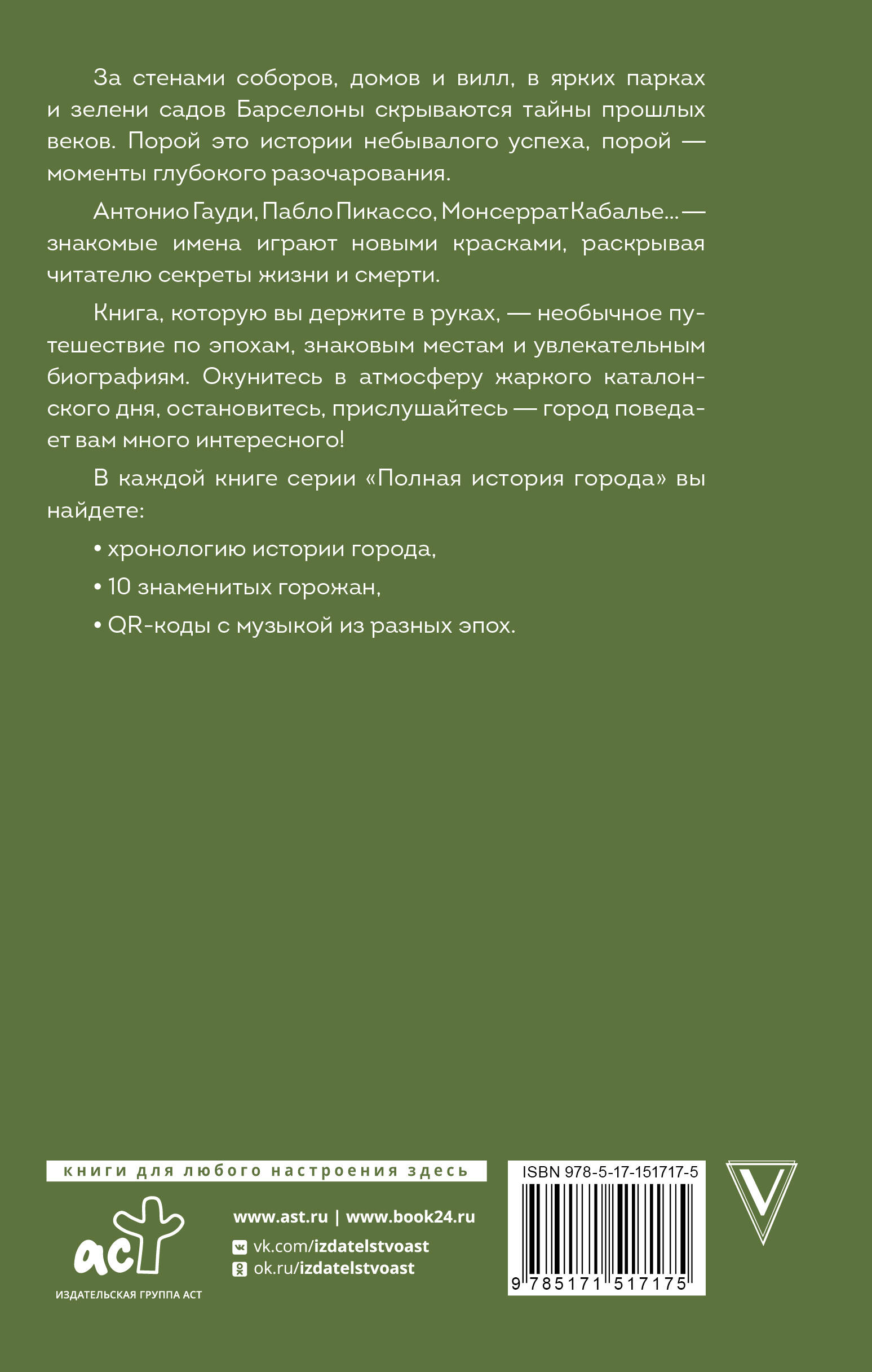 За стенами соборов, домов и вилл, в ярких парках и зелени садов Барселоны скрываются тайны прошлых веков. Порой это истории небывалого успеха, порой - моменты глубокого разочарования. Антонио Гауди, Пабло Пикассо, Монсерат Кабалье… - знакомые имена играют новыми красками, раскрывая читателю секреты жизни и смерти. Книга, которую вы держите, - необычное путешествие по эпохам, знаковым местам и увлекательным биографиям. Окунитесь в атмосферу жаркого каталонского дня, остановитесь, прислушайтесь - город поведает вам много интересного! В каждой книге вы найдете: • Хронологию истории города • 10 знаменитых горожан • QR-коды, с музыкой из разных эпох.| Издательство | Издательство "АСТ" |