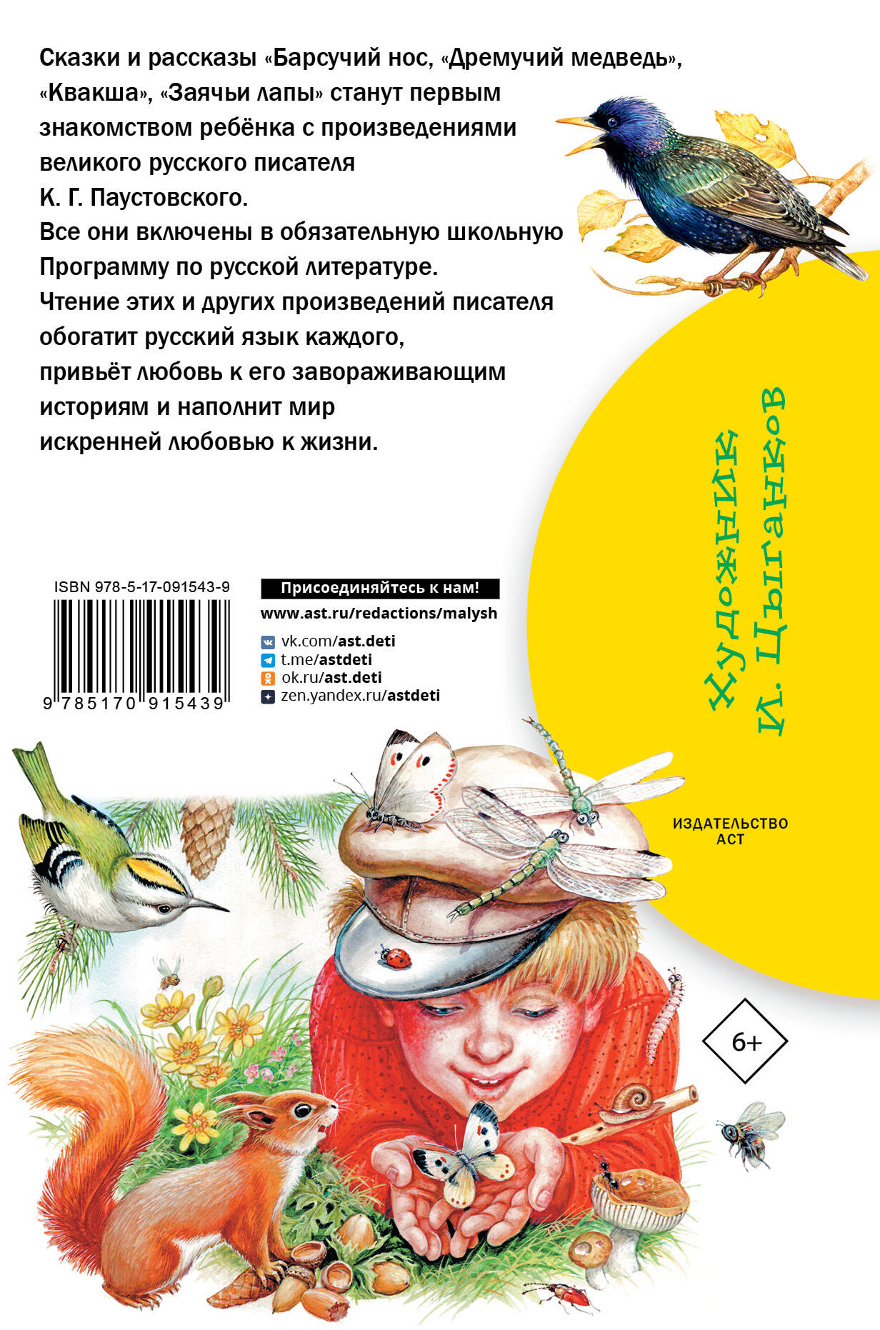 В сборник "Барсучий нос" вошли рассказы и сказки русского писателя К. Г. Паустовского. Среди них "Барсучий нос", "Квакша", "Дремучий медведь", "Заячьи лапы". Писатель трогательно описывает свои наблюдения про жизнь животных в природе, учит детей быть наблюдательными, беречь, познавать и любить родной край, как любил его автор.