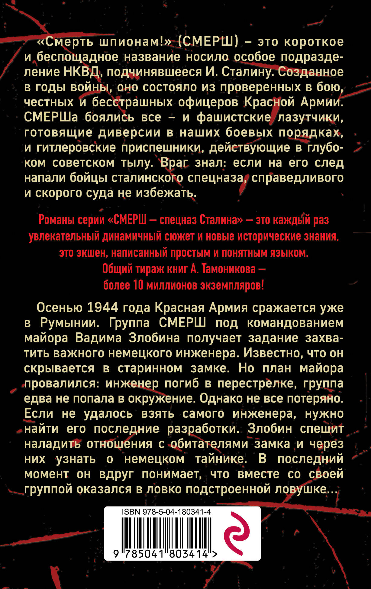 «Смерть шпионам!» (СМЕРШ) - это короткое и беспощадное название носило особое подразделение НКВД, подчинявшееся И. Сталину. Созданное в годы войны, оно состояло из проверенных в бою, честных и бесстрашных офицеров Красной Армии. СМЕРШа боялись все - и фашистские лазутчики, готовящие диверсии в наших боевых порядках, и гитлеровские приспешники, действующие в глубоком советском тылу. Враг знал: если на его след напали бойцы сталинского спецназа, справедливого и скорого суда не избежать. Романы серии «СМЕРШ - спецназ Сталина» - это каждый раз увлекательный динамичный сюжет и новые исторические знания, это экшен, написанный простым и понятным языком. Общий тираж книг А. Тамоникова - более 10 миллионов экземпляров! Осенью 1944 года Красная Армия сражается уже в Румынии. Группа СМЕРШа под командованием майора Вадима Злобина получает задание захватить важного немецкого инженера. Известно, что он скрывается в старинном замке. Но план майора провалился: инженер погиб в перестрелке, группа едва не попала в окружение. Однако, не все потеряно. Если не удалось взять самого инженера, нужно найти его последние разработки. Злобин спешит наладить отношения с обитателями замка и через них узнать о немецком тайнике. В последний момент он вдруг понимает, что вместе со своей группой оказался в ловко подстроенной ловушке…| Издательство | ООО "Издательство "Эксмо" |