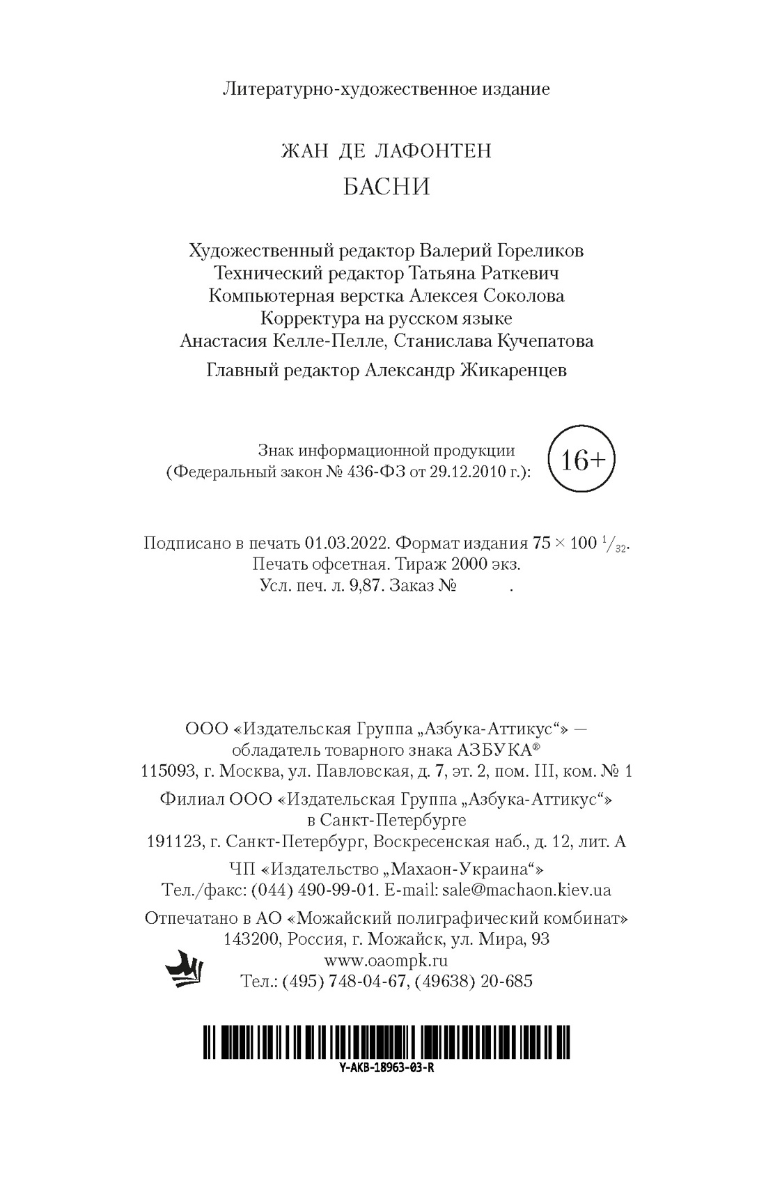 Жан де Лафонтен - выдающийся сатирик и вольнодумный мыслитель, был лучшим баснописцем Нового времени. Заимствуя сюжеты у Эзопа и других античных авторов, а также у восточных мудрецов, он создает причудливый зверинец, олицетворяющий тогдашнее французское общество эпохи Людовика Четырнадцатого. Вокруг венценосного Льва, свирепого и любвеобильного, толпятся льстивые и угодливые придворные, звери-вассалы льстят, заискивают, интригуют, грызутся за теплое местечко при дворе. «Да бросьте же губить друг друга, господа!» - взывает к ним поэт. В те времена в доме каждого французского крестьянина непременно были Библия и басни Лафонтена, во Франции XXI века с великим баснописцем знакомятся уже со школьной скамьи. Недаром его прозвали французским Гомером, а его басни «Ворона и Лисица» и «Стрекоза и Муравей» и многие другие знает наизусть почти каждый француз.| Издательство | Азбука |
