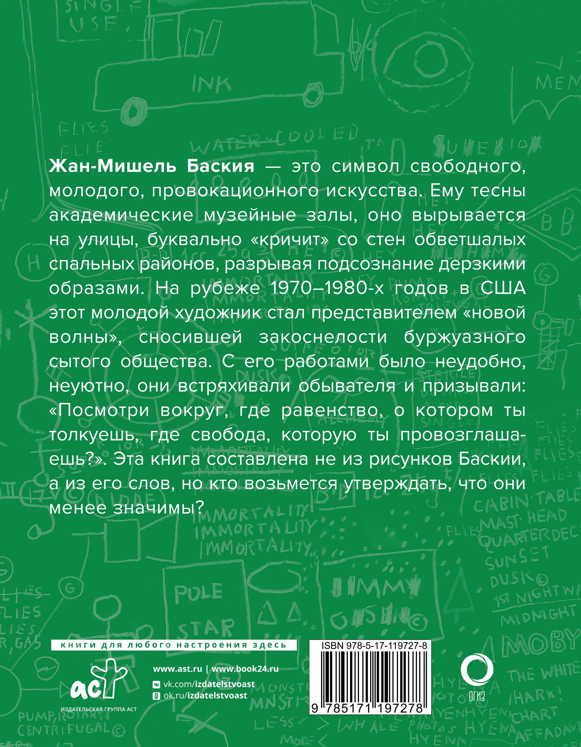 С творчеством Жана-Мишеля Баския знакомы, пожалуй, все, кто знает о современном искусстве чуть больше, чем о существовании квадрата Малевича. При этом Жан-Мишеля часто представляют как бродягу, внезапно обретшего славу. Однако история Баския намного интереснее. К сожалению, он - член злополучного "клуба 27", так что биография Жана-Мишель довольно коротка. Но его наследие настолько большое, что до сих пор то на одной, то на другой выставке всплывают ранее неопубликованные дневники, фотографии или даже работы художника. Баския, является одним из важнейших творцов XX века. Творческий стиль Баския новаторский и нестандартный. Это давало ему определенную свободу, которую не могли себе позволить другие художники. Его произведения составлялись из нескольких слоев, где были разные символы и надписи из газет, меню близлежащих кафе и других элементов поп-культуры. Полотно художника, чем бы оно ни являлось, составляет из себя многослойную композицию. Ее нужно исследовать, словно энциклопедию, где за каждой литерой таятся новые значения. Тематика работ была многообразна. Как и многие художники, Жан-Мишель высказывался через свое творчество. Он работал с Энди Уорхолом, а Бэнкси вдохновлялся его творчеством. В своих картинах, записных книжках и интервью он показал себя сильным и творческим писателем и оратором, а также имиджмейкером. "Basquiat-измы" -это сборник важнейших цитат этого крестного отца стрит-арта. В этих кратких, убедительных и запоминающихся подборках, взятых из его интервью, а также из его дневников, Баския пишет и говорит о культуре, своей артистической персоне, мире искусства, художественном влиянии, расе, городской жизни и многих других темах. Лаконичные, прямые, сильные, поэтичные и загадочные слова Баскиа, как и его искусство, продолжают находить отклик.| Издательство | ИЗДАТЕЛЬСТВО "АСТ" |