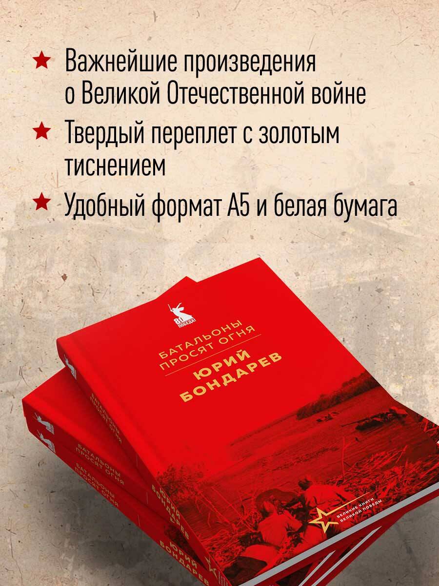 Великие книги Великой Победы. Должен знать каждый. В этом году вся Россия и весь мир отмечает 80-летие Победы над фашизмом. Для каждого из нас Великая Война и память о ней - священна. К сожалению, живых свидетелей и героических участников страшных событий почти не осталось. Но у нас есть их воспоминания в книгах и фильмах военных лет. Цель серии - вспомнить главные книги победы, показать детям и подросткам важность их чтения, сохранить и передать главное слово о войне, написанное кровью и мужеством советских военных писателей. Серия в новом современном оформлении включает в себя культурный минимум книг по Великой Отечественной войне, который должен знать каждый. Юрий Васильевич Бондарев (1924-2020) - известный русский писатель, сценарист и общественный деятель, воевавший в годы Великой Отечественной войны под Сталинградом и принимавший участие в освобождении Киева и Житомира. События его повести «Батальоны просят огня» разворачиваются на Украине в 1943 году. Двум батальонам отдан приказ занять плацдарм при форсировании Днепра и подать сигнал артиллерии для дальнейшего наступления. Однако последующий приказ командования уже гласил «держаться насмерть своими огневыми средствами»... Честное, правдивое и бескомпромиссное повествование о судьбах простых солдат, которые отдали жизни во имя Великой Победы.| Издательство | ООО "Издательство "Эксмо" |
