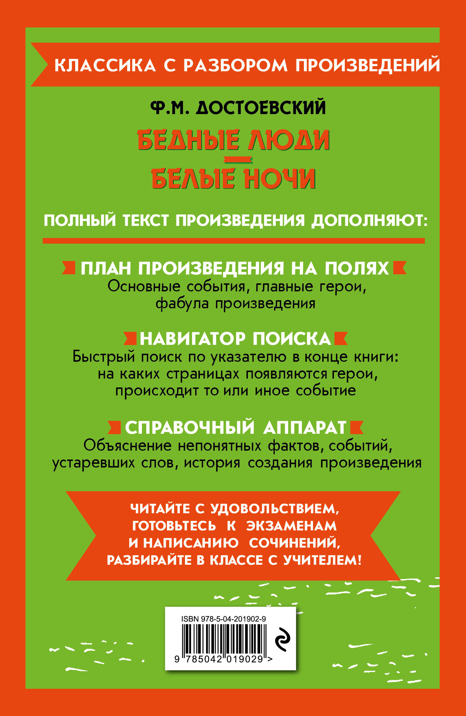 В книгу вошли два легендарных произведения, написанные классиком мировой литературы, одним из самых читаемых писателей в мире Ф. М. Достоевским. Роман «Бедные люди» и повесть «Белые ночи» до сих пор пользуются большой популярностью как среди школьников, так и среди представителей старшего поколения. Новое издание этих произведений станет незаменимым помощником в подготовке к ЕГЭ, ОГЭ и урокам литературы. В нем вы найдете уникальные справочные материалы: заметки на полях для быстрого поиска нужного фрагмента, развернутые комментарии, где объясняются устаревшие слова и непонятные факты, историю создания произведений, указатель имен и событий. Все это поможет не только быстро и легко подготовиться к экзаменам, но и узнать новые факты, которые можно было упустить на уроке. Роман в письмах «Бедные люди» изображает жизнь «маленького человека», его переживания и думы, рассказывает о жестокости и несправедливости жизни, которая не дает героям ни малейшего шанса вырваться из бедности и обрести счастье. Их богатство - только в их душах. В повести «Белые ночи» главный герой - бедный мечтатель, который страдает от одиночества. Однажды вечером он встречает рыдающую девушку, общение с которой озаряет его унылую жизнь. Герой влюбляется в нее, но не знает, ответит ли она ему взаимностью.| Издательство | ООО "Издательство "Эксмо" |