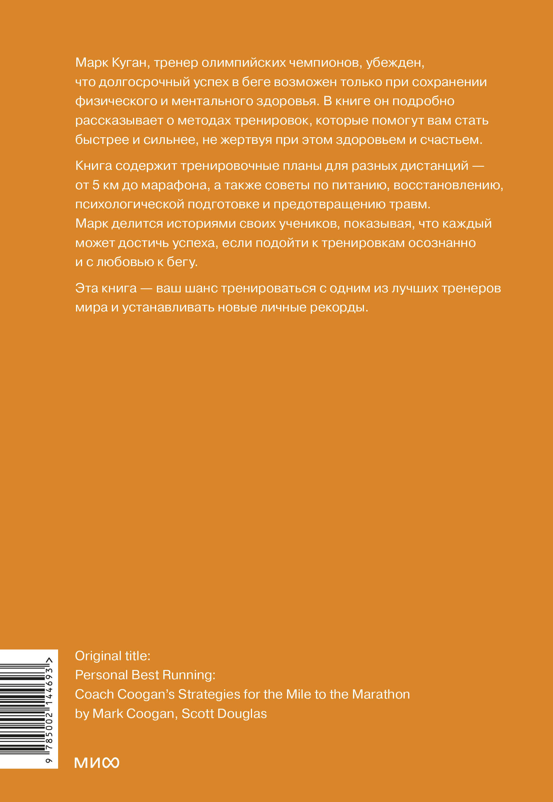 Марк Куган, тренер олимпийских чемпионов, убежден, что долгосрочный успех в беге возможен только при сохранении физического и ментального здоровья. В книге он подробно рассказывает о методах тренировок, которые помогут вам стать быстрее и сильнее, не жертвуя при этом здоровьем и счастьем. Книга содержит тренировочные планы для разных дистанций - от 5 км до марафона, а также советы по питанию, восстановлению, психологической подготовке и предотвращению травм. Марк делится историями своих учеников, показывая, что каждый может достичь успеха, если подойти к тренировкам осознанно и с любовью к бегу. Эта книга - ваш шанс тренироваться с одним из лучших тренеров мира и устанавливать новые личные рекорды.| Издательство | МИФ ООО |