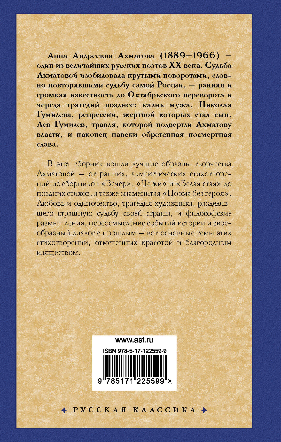 В этот сборник вошли лучшие образцы творчества Ахматовой - от ранних акмеистических стихотворений из сборников "Вечер", "Четки" и "Белая стая" до поздних стихов, а также знаменитая "Поэма без героя". Любовь и одиночество, трагедия художника, разделившего страшную судьбу своей страны и философские размышления, переосмысление событий истории и своеобразный диалог с прошлым - вот основные темы этих стихотворений, отмеченных красотой и благородным изяществом.| Издательство | ИЗДАТЕЛЬСТВО "АСТ" |