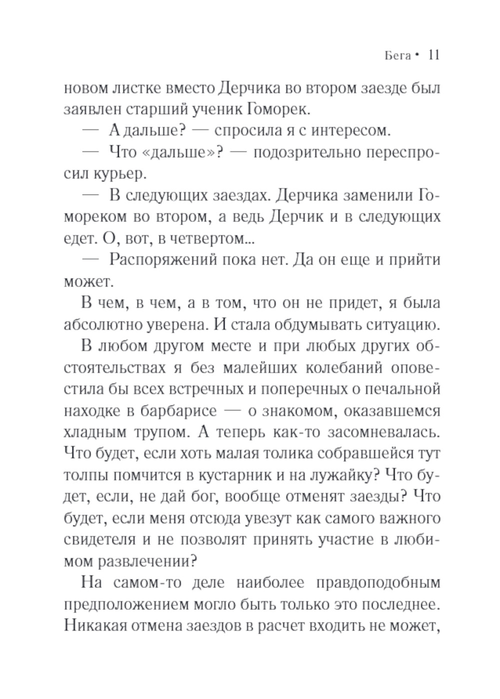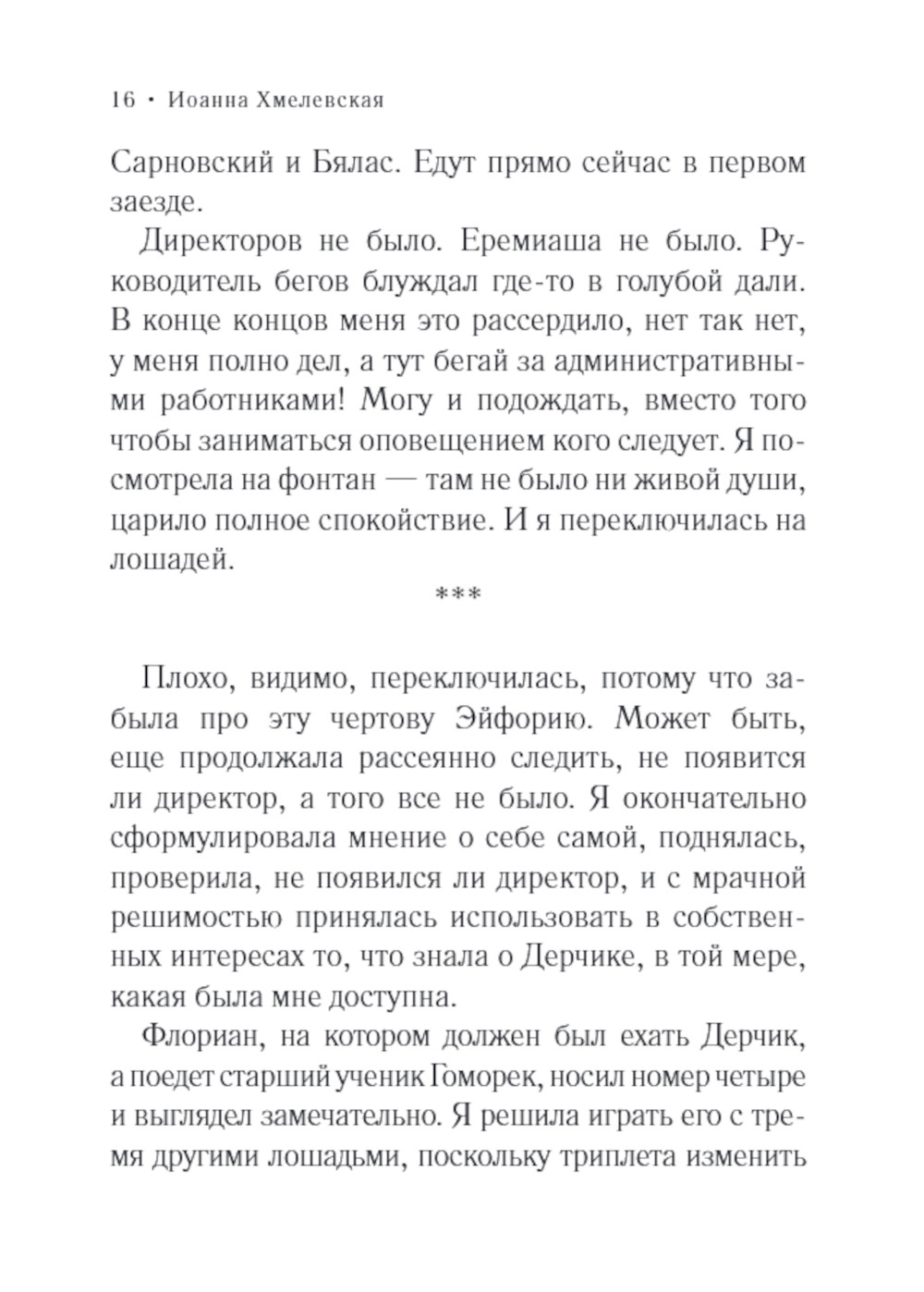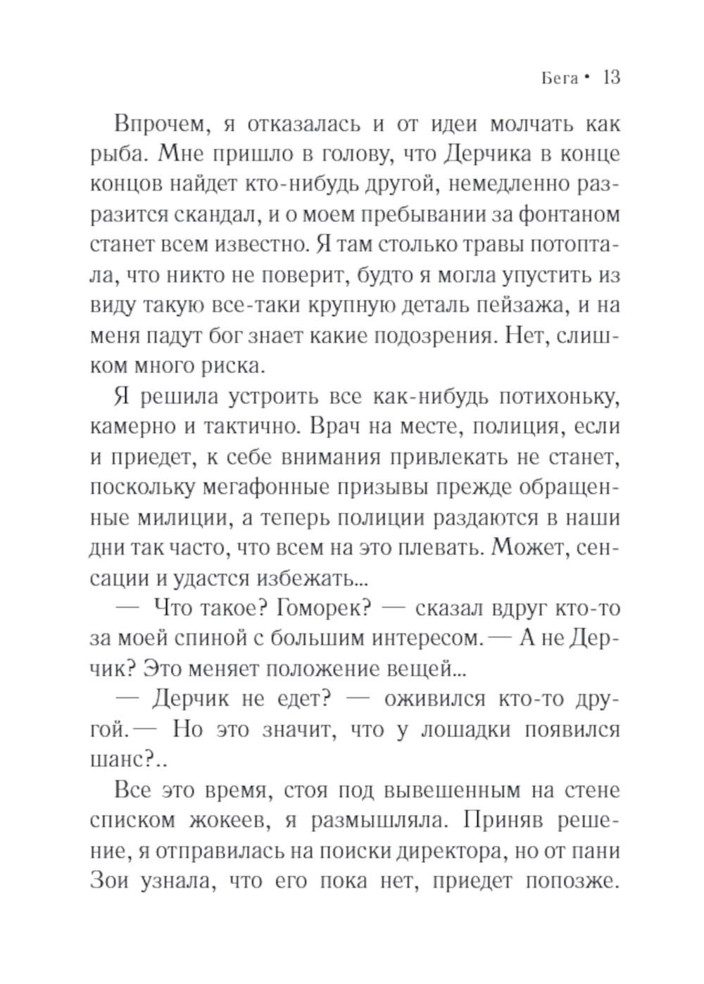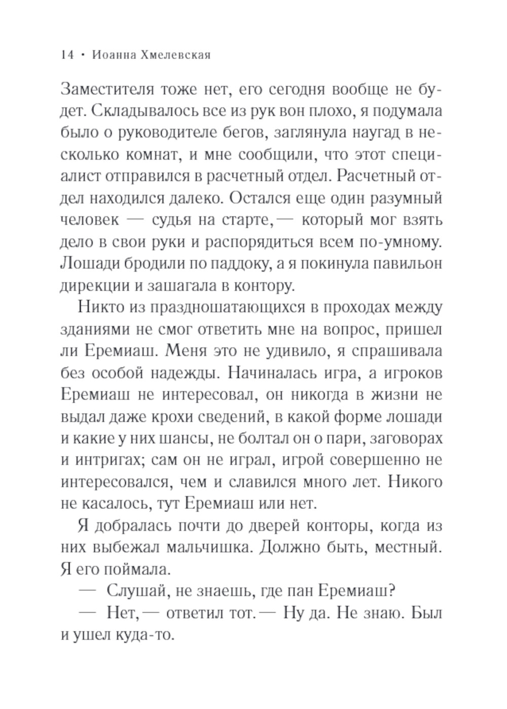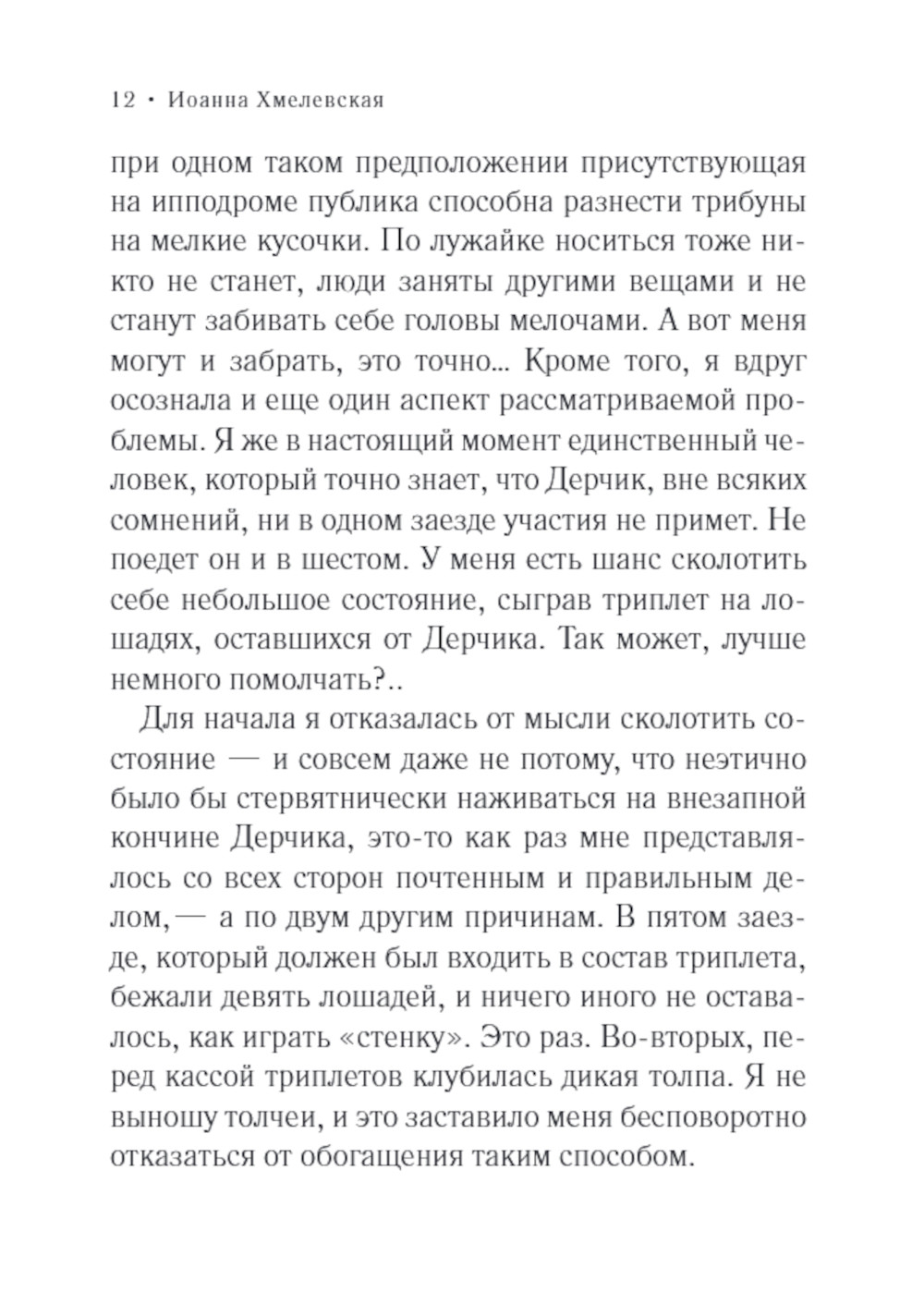 Доводилось ли вам играть на бегах? Нет? Тогда знакомство с азартной, ревущей толпой, толкающей друг друга в очередях к кассам, сыплющей фуксами и триплетами и теряющей купоны со ставками в ответственные моменты, может ошарашить или даже напугать вас. А вот пани Иоанна страстно любит скачки и прекрасно разбирается не только в мудреной терминологии, но и в закулисных тайнах ипподрома. Поэтому неудивительно, что полицейские, расследуя убийство жокея Дерчика - его труп обнаружила та же пани, - обращаются к ней за советом. С этого момента у преступников нет ни единого шанса уйти от заслуженной расплаты!| Издательство | Аркадия |