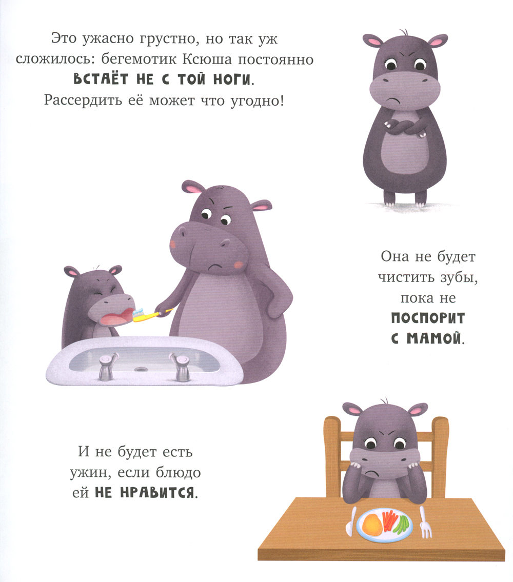 Бегемотик Ксюша злится каждый день. Порой ей даже кажется, что она скоро лопнет! Вот и сегодня Ксюша проснулась мрачнее тучки. Она не хотела идти в детский сад, но ей пришлось: сегодня там «Весёлые старты». Однако результаты соревнований ещё больше разозлили бегемотика Ксюшу… Что же делать? Как научиться контролировать эмоции? Как вести себя, когда испытываешь сильный гнев? Эта трогательная сказка про дружбу бегемотика Ксюши и цапли Саши поможет объяснить детям, что такое гнев, зачем он нам нужен, а также научит пошаговыми действиями справляться с неожиданными вспышками раздражения.| Издательство | Клевер-Медиа-Групп |