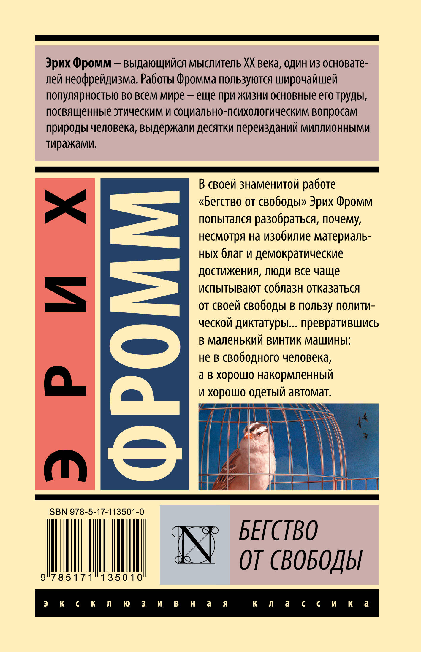 Эрих Фромм - выдающий мыслитель ХХ века, один из основателей неофрейдизма. Работы Фромма пользуются широчайшей популярностью во всем мире - еще при жизни основные его труды, посвященные этическим и социально-психологическим вопросам природы человека, выдержали десятки переиз­даний миллионными тиражами. В своей знаменитой работе "Бегство от свободы" Эрих Фромм попытался разобраться, почему, несмотря на изобилие материальных благ и демократические достижения, люди все чаще испытывают соблазн отказаться от своей свободы в пользу политической диктатуры… превратившись в маленький винтик машины: не в свободного человека, а в хорошо накормленный и хорошо одетый автомат.