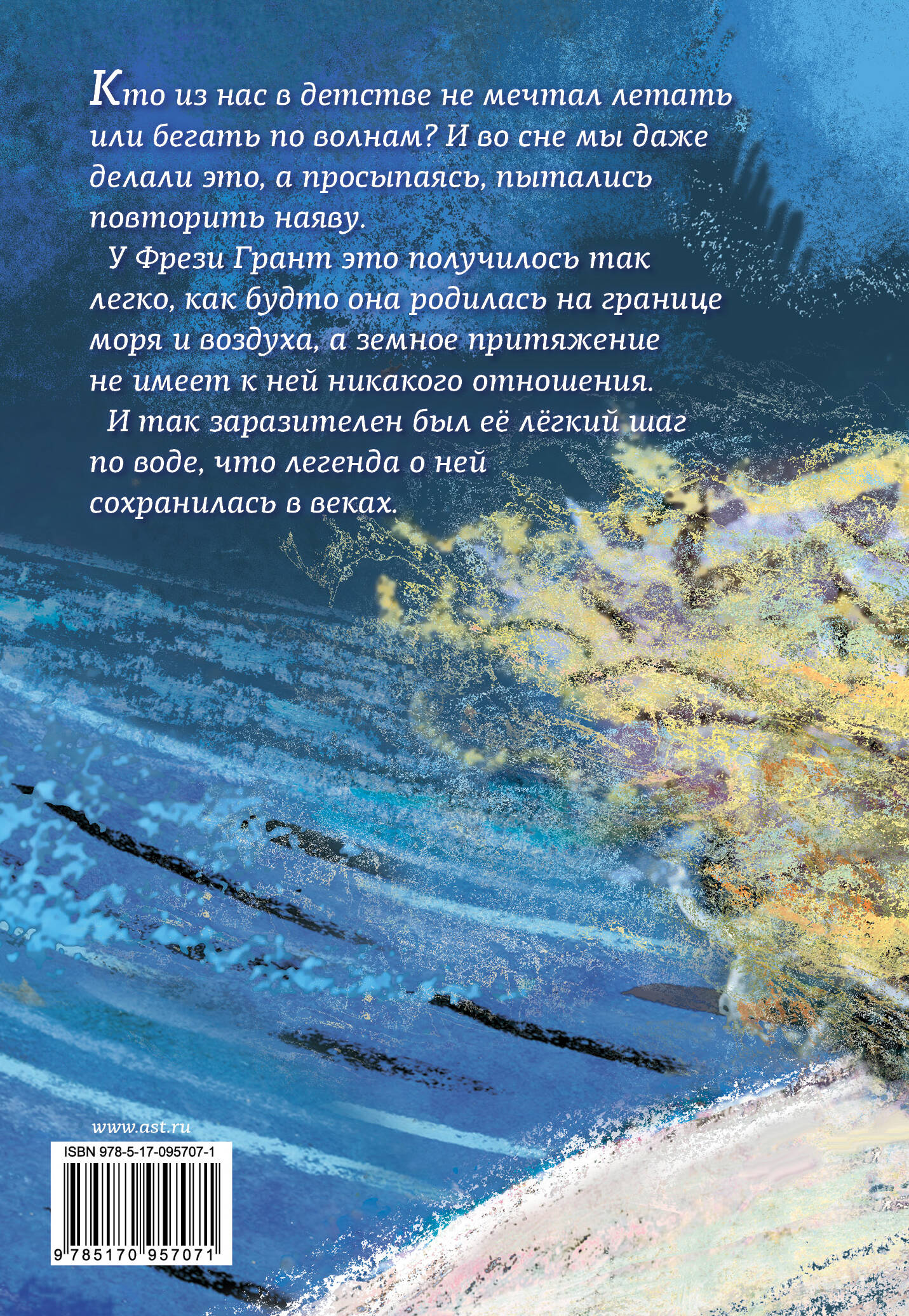 Кто из нас в детстве не мечтал летать или бегать по волнам? И во сне мы даже делали это, а просыпаясь, пытались повторить наяву. У Фрези Грант это получилось так легко, как будто она родилась на границе моря и воздуха, а земное притяжение не имеет к ней никакого отношения. И так заразителен был её лёгкий шаг по воде, что легенда о ней сохранилась в веках.| Издательство | ИЗДАТЕЛЬСТВО "АСТ" |