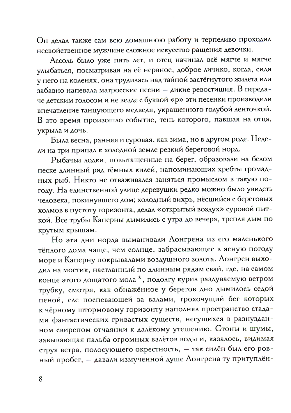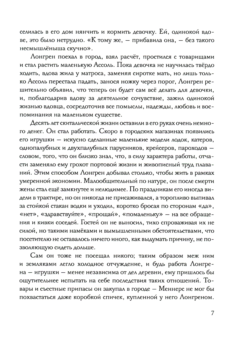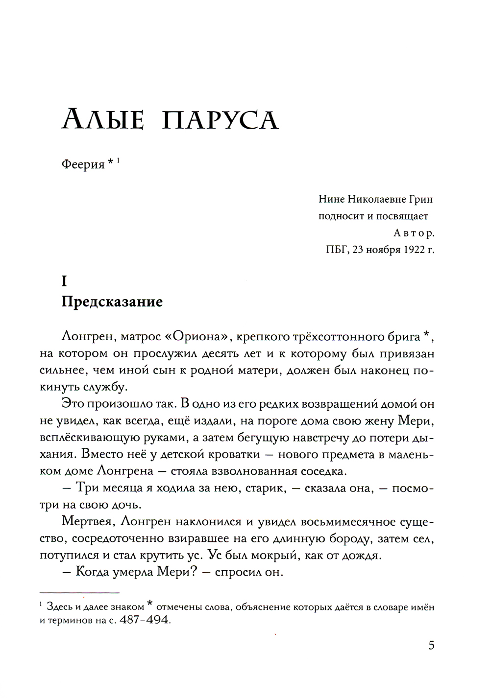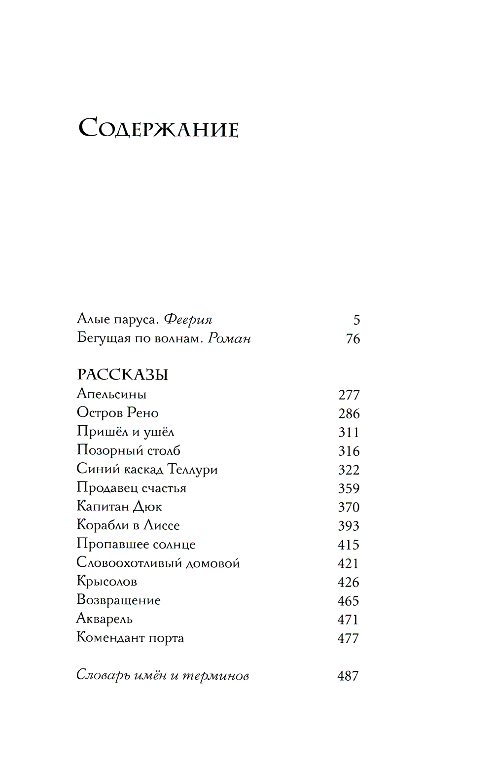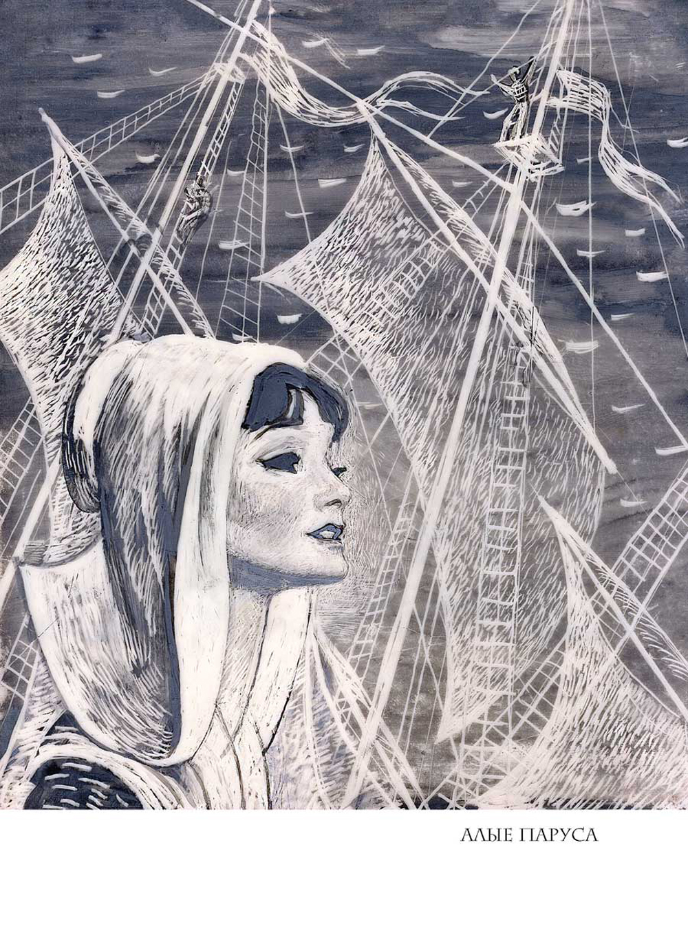 «Рано или поздно, под старость или в расцвете лет, Несбывшееся зовёт нас, и мы оглядываемся, стараясь понять, откуда прилетел зов. Тогда, очнувшись среди своего мира, тягостно спохватясь и дорожа каждым днём, всматриваемся мы в жизнь, всем существом стараясь разглядеть, не начинает ли сбываться Несбывшееся?..» - сказано в мудрой книге А. Грина «Бегущая по волнам»… «Запрещать мечту - значит, не верить в счастье, а не верить в счастье - значит, не жить», - любил повторять светлый романтик А. Грин. Символом сбывшейся мечты, чуда, созданного собственными руками, стали его «Алые паруса»… Сказка нужна не только детям. Сказка вызывает волнение - источник высоких человеческих страстей, она не даёт успокоиться, показывает иную тревожащую нас жизнь. В этом её ценность, и в этом ценность могучего обаяния рассказов А. Грина… В настоящий сборник включены и роман «Бегущая по волнам», и повесть-феерия «Алые паруса», и серия написанных в разные годы рассказов, - проиллюстрированные «самым гриновским художником» Саввой Бродским. Эти рисунки были созданы в начале 1960-х годов к изданию шеститомного собрания сочинений писателя.| Издательство | Речь |