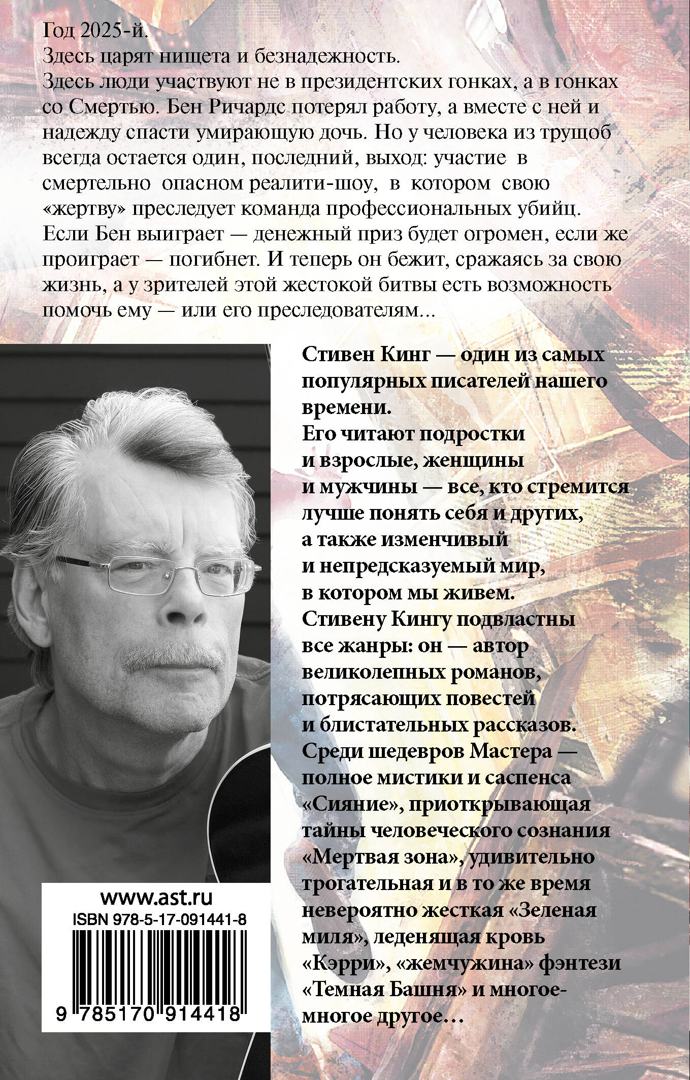 Год 2025-й. Здесь царит нищета и безнадежность. Здесь люди участвуют не в президентских гонках, а в гонках со Смертью. Бен Ричардс потерял работу, а вместе с ней и надежду спасти умирающую дочь. Но у человека из трущоб всегда остается один, последний, выход: участие в смертельно опасном реалити-шоу, в котором свою "жертву" преследует команда профессиональных убийц. Если Бен выиграет - денежный приз будет огромен, если же проиграет - погибнет. И теперь он бежит, сражаясь за свою жизнь, а у зрителей этой жестокой битвы есть возможность помочь ему - или его преследователям…| Издательство | ИЗДАТЕЛЬСТВО "АСТ" |