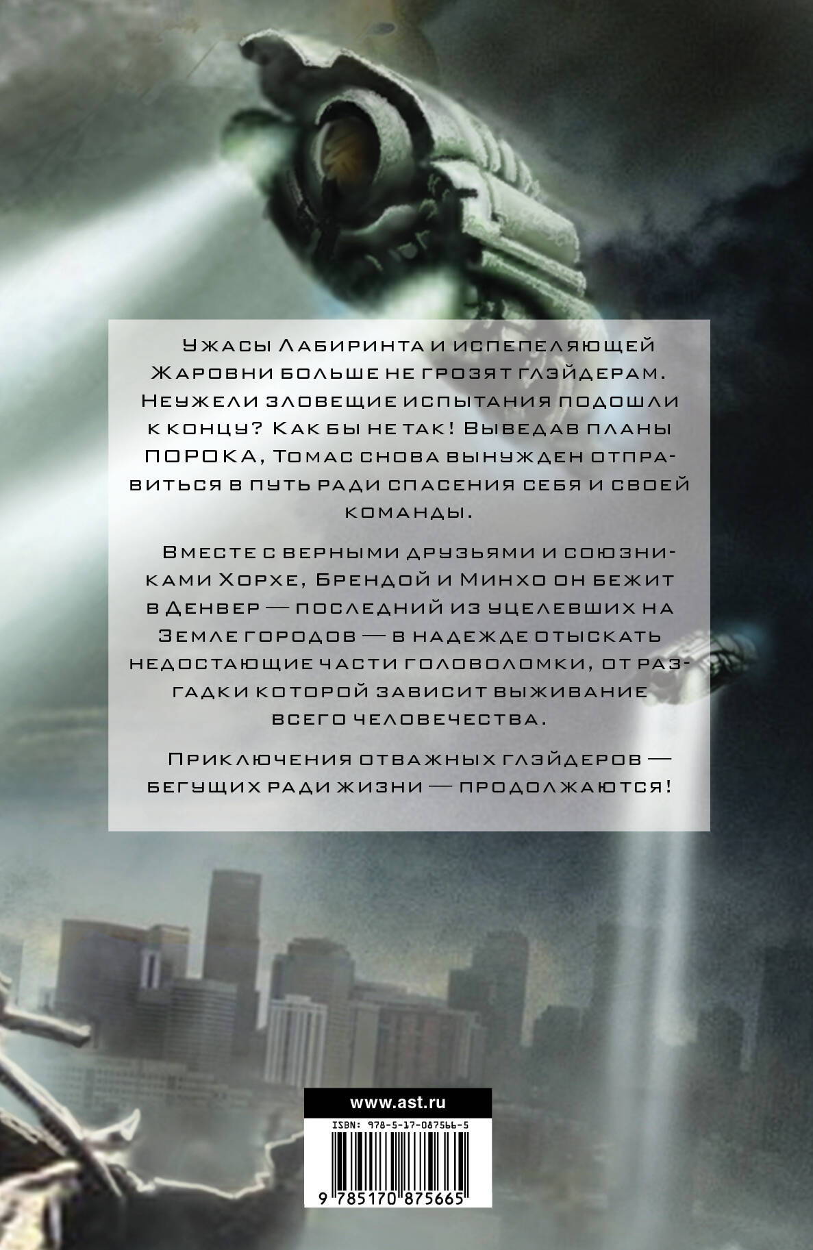Ужасы Лабиринта и испепеляющей Жаровни больше не грозят глэйдерам. Неужели зловещие испытания подошли к концу? Как бы не так! Выведав планы ПОРОКА, Томас снова вынужден отправиться в путь ради спасения себя и своей команды. Вместе с верными друзьями и союзниками Хорхе, Брендой и Минхо он бежит в Денвер - последний из уцелевших на Земле городов, в надежде отыскать недостающие части головоломки, от разгадки которой зависит выживание всего человечества. Приключения отважных глэйдеров - бегущих ради жизни - продолжаются!| Издательство | Издательство "АСТ" |