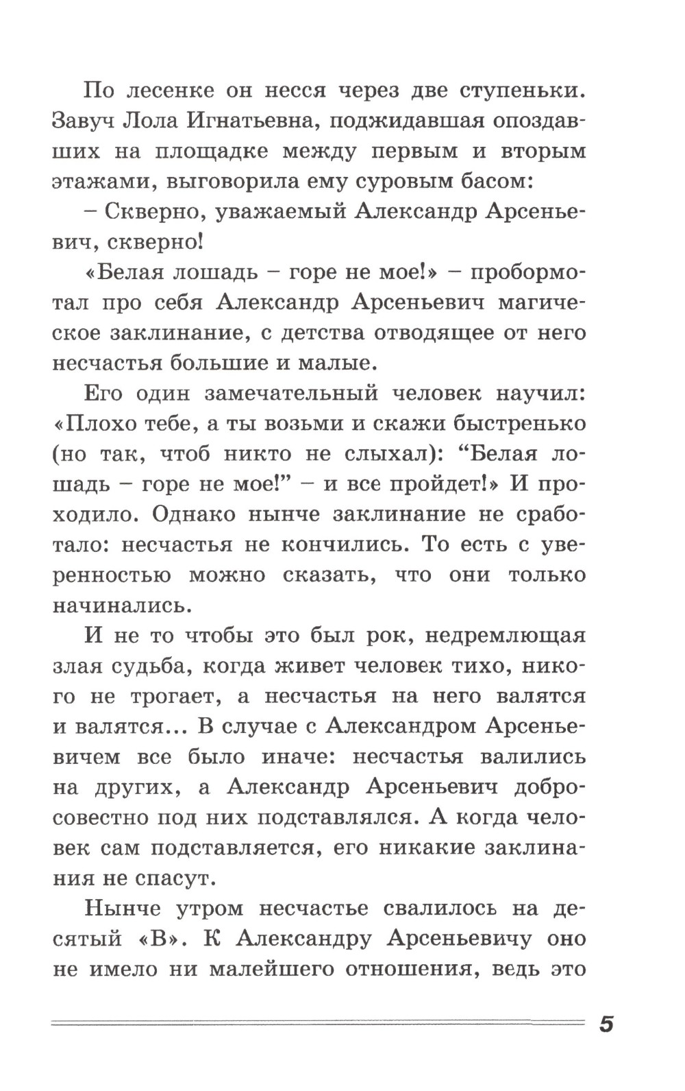Кто-то торопится поскорее расстаться со школой, а кто-то - намеренно возвращается в нее после пединститута. Саня, молодой учитель географии, больше похожий на девятиклассника, чем на учителя, еще верит, что старая присказка: "Белая лошадь - горе не моё" убережет от беды. Максималист по натуре, он вместе со своим шестым "Б" ищет справедливости, страдает, задается серьезными вопросами, разочаровывается, влюбляется - и продолжает учиться вместе с ребятами. Учиться жизни… Для среднего и старшего школьного возраста.