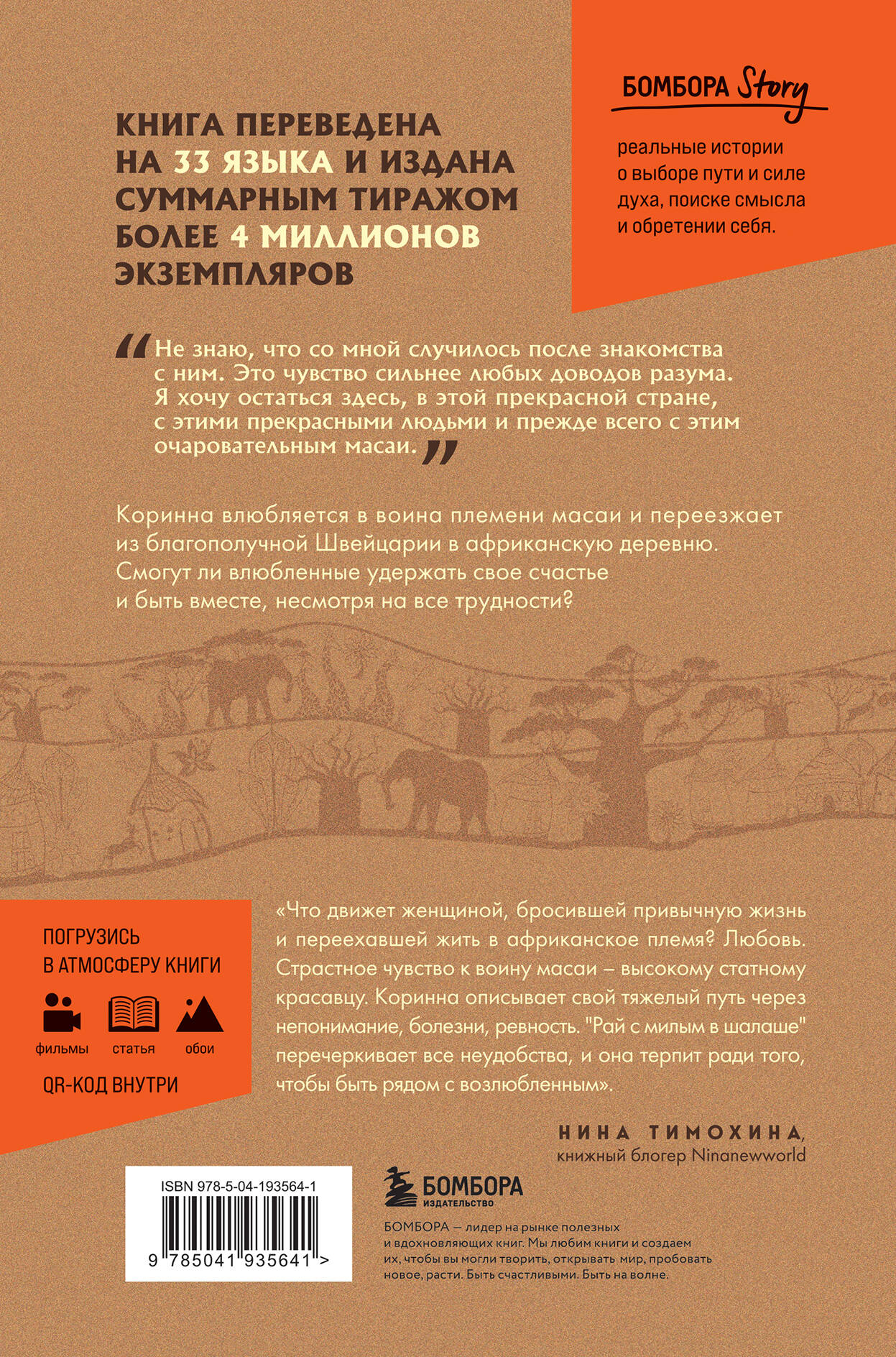 Новинка в коллекции Бомбора Story. Книга переведена на 33 языка и издана суммарным тиражом более 4 миллионов экземпляров. Экранизация 2005 года. Любовная история и приключенческий роман под одной обложкой. Она - современная преуспевающая девушка из благополучной Швейцарии. Он - воин затерянного во времени африканского племени масаи. Смогут ли они удержать свое счастье и быть вместе, несмотря на все трудности?| Издательство | ООО "Издательство "Эксмо" |
