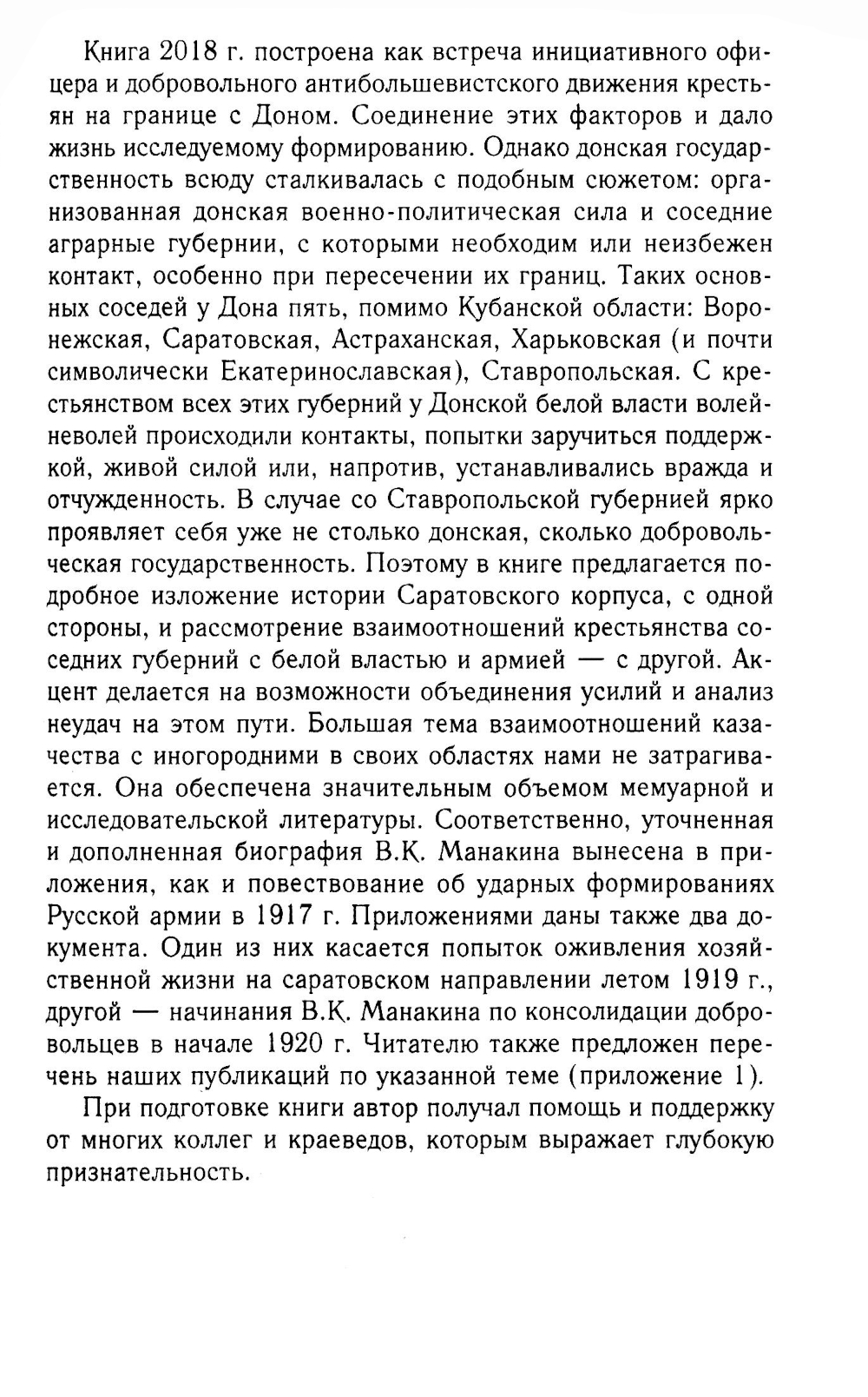 Книга посвящена одной из ключевых тем Гражданской войны в России - взаимодействию политической власти и крестьянского большинства населения страны. События 1917-1922 гг. породили множество вариантов такого взаимодействия как на красной, так и на белой стороне. Все стороны противостояния вовлекали деревню в вооруженную борьбу, иначе невозможно было рассчитывать на военную победу. При этом коммуникация с «мужиком» являлась общепризнанной ахиллесовой пятой Белого движения. Неспособность создать уверенность в приходе твердой власти, развеять старые социальные фобии, массово поднять деревню под национальные знамена стала одной из очевидных причин неудачи белой борьбы. Тем важнее подробный анализ опыта успешного сотрудничества белых военных и политических инстанций с сельским населением. Один из таких сюжетов разворачивался на границе Области войска Донского и Саратовской губернии, на фоне знаменитой битвы за Царицын. Энергичный офицер В. К. Манакин при поддержке донского атамана П. Н. Краснова смог создать боеспособное формирование из крестьян юга Саратовской губернии - Саратовский корпус. История этого воинского формирования рассматривается в контекстах Гражданской войны на Юге, крестьянско-казачьих взаимоотношений, особенностей военного строительства Войска Донского, Добровольческой, Южной, Астраханской армий. Настроение и поведение саратовских крестьян сравнивается с таковыми крестьян Ставропольской, Астраханской, Воронежской губерний.| Издательство | Центрполиграф |