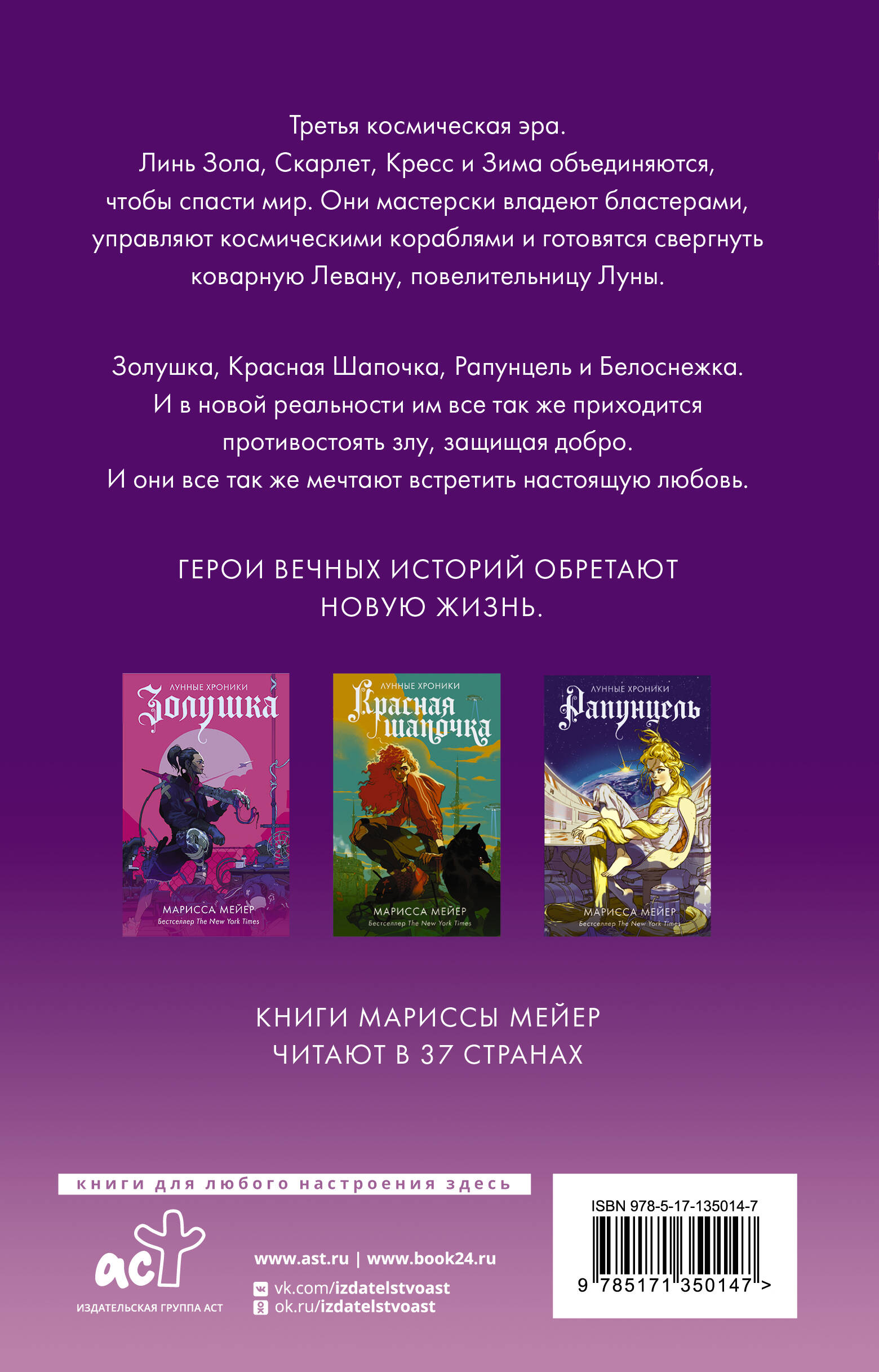 Третья космическая эра. Линь Зола, Скарлет, Кресс и Винтер объединяются, чтобы спасти мир. Они мастерски владеют бластерами, управляют космическими кораблями и готовятся свергнуть коварную Левану, повелительницу Луны. Золушка, Красная Шапочка, Рапунцель и Белоснежка. И в новой реальности им все так же приходится противостоять злу, защищая добро. И они все так же мечтают встретить настоящую любовь. Герои вечных историй обретают новую жизнь.| Издательство | ИЗДАТЕЛЬСТВО "АСТ" |