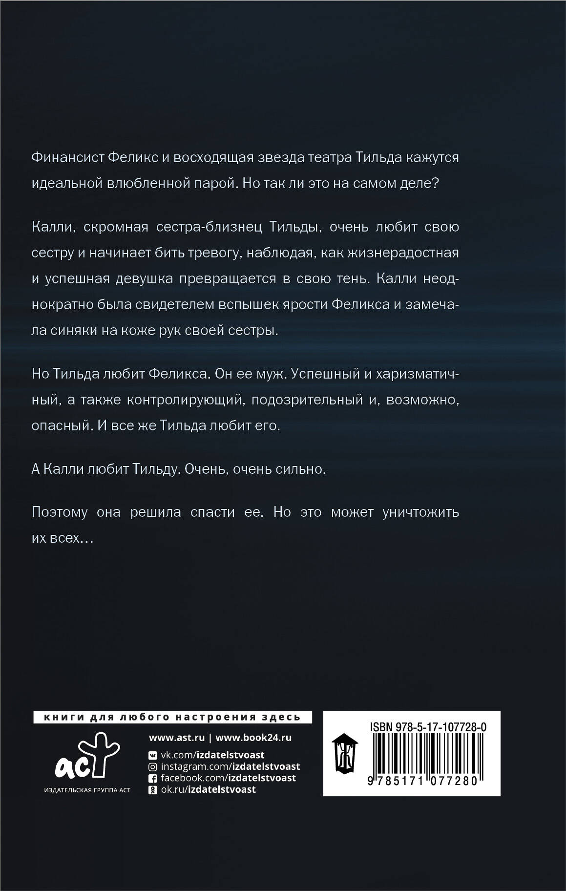 Финансист Феликс и восходящая звезда театра Тильда кажутся идеальной влюбленной парой. Но так ли это на самом деле? Калли, скромная сестра-близнец Тильды, очень любит свою сестру и начинает бить тревогу, наблюдая, как жизнерадостная и успешная девушка превращается в свою тень. Калли неоднократно была свидетелем вспышек ярости Феликса и замечала синяки на коже рук своей сестры. Но Тильда любит Феликса. Он ее муж. Успешный и харизматичный, а также контролирующий, подозрительный и, возможно, опасный. И все же Тильда любит его. А Калли любит Тильду. Очень, очень сильно. Поэтому она решила спасти ее. Но это может уничтожить их всех…| Издательство | ИЗДАТЕЛЬСТВО "АСТ" |